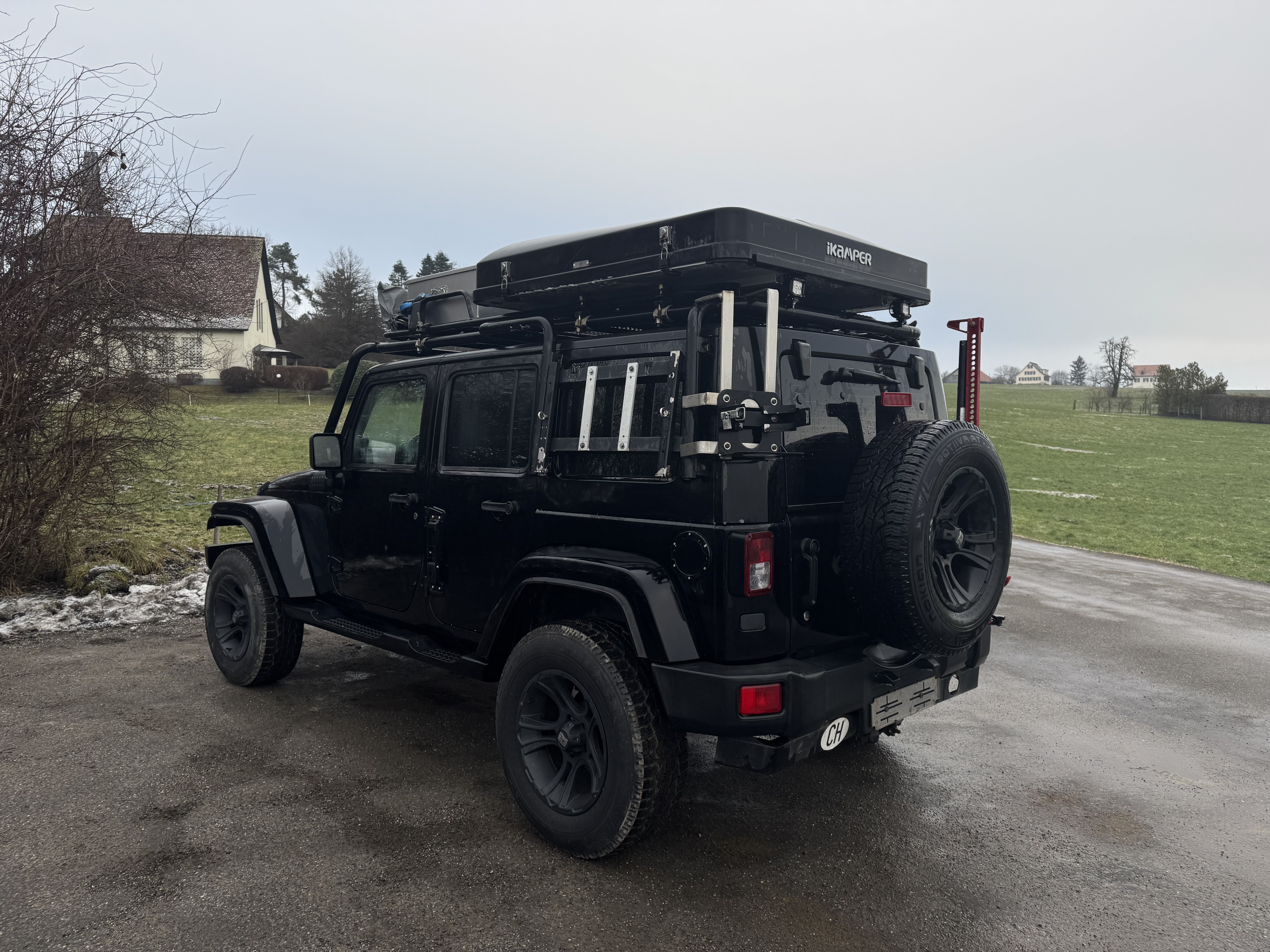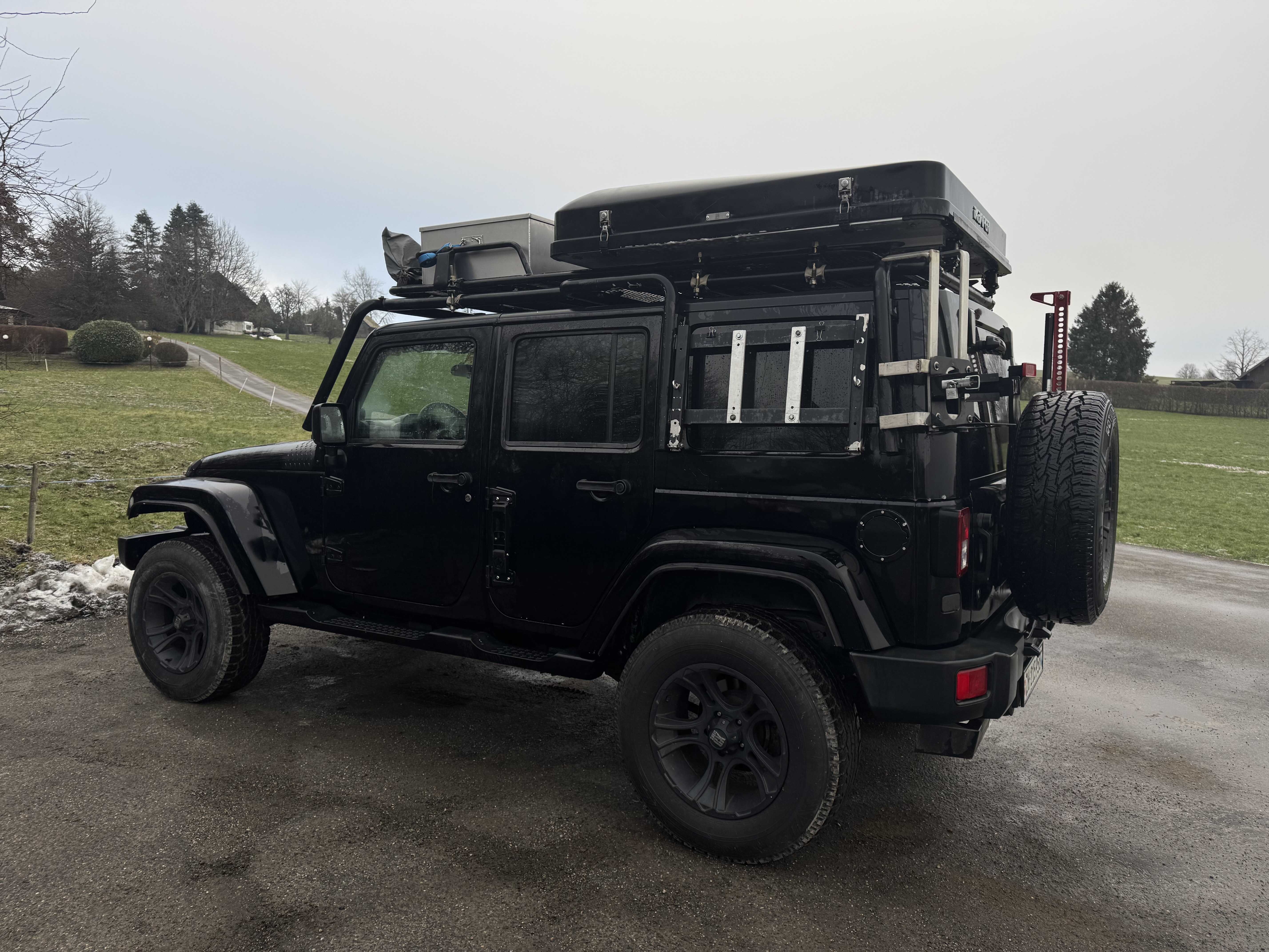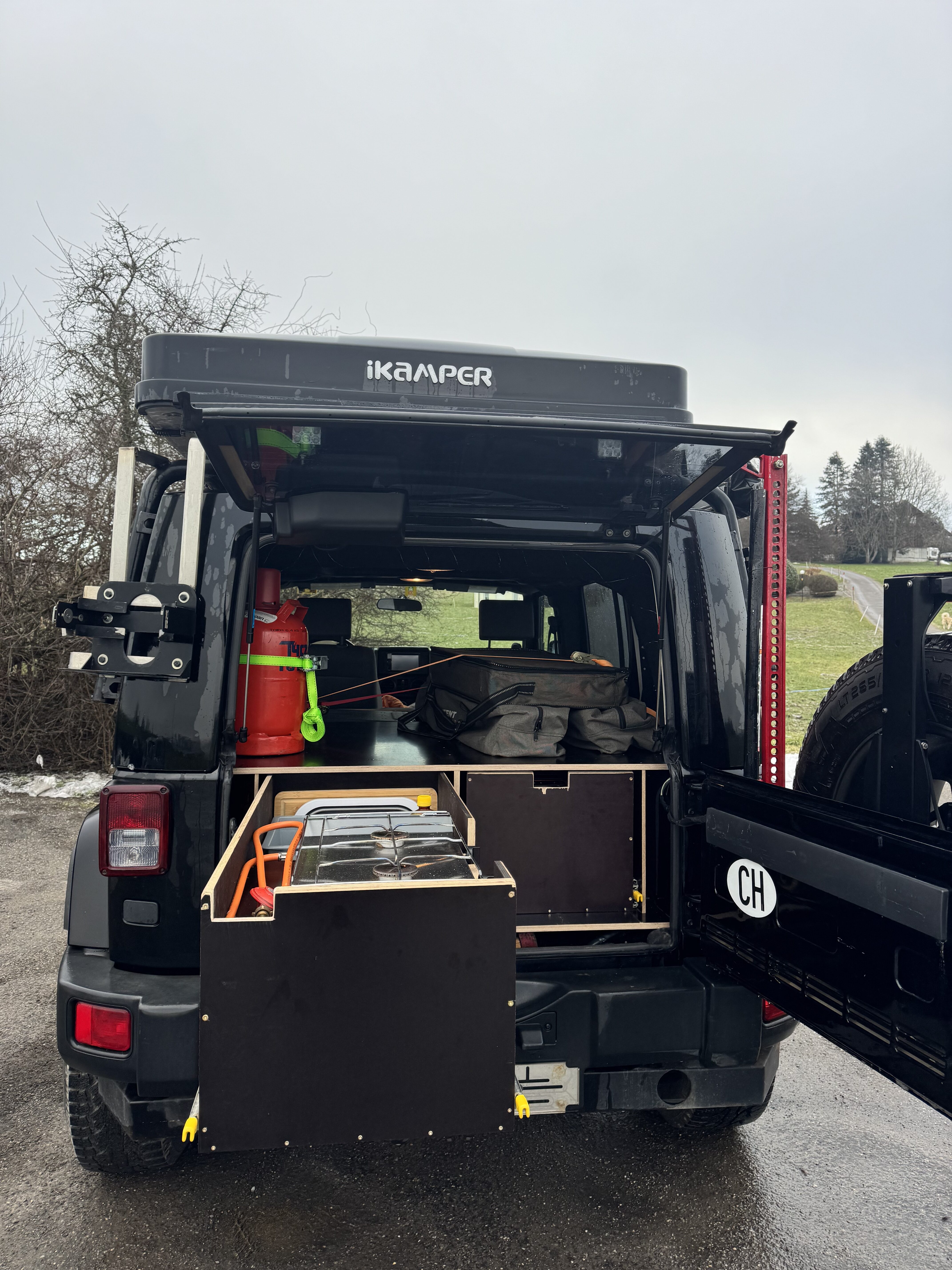 Il s'agit d'une Jeep avec 125'981 km, qui a été démontée par nous et le propriétaire précédent. Il ne reste que les sièges du conducteur et du passager, car tout l'espace arrière a été démonté. Dans le coffre se trouve la cuisine et un autre tiroir extensible. La glacière est intégrée à l'ensemble du montage, mais peut être rapidement démontée. Il y a également un bidon d'eau fraîche de 20 l, avec un support adapté.