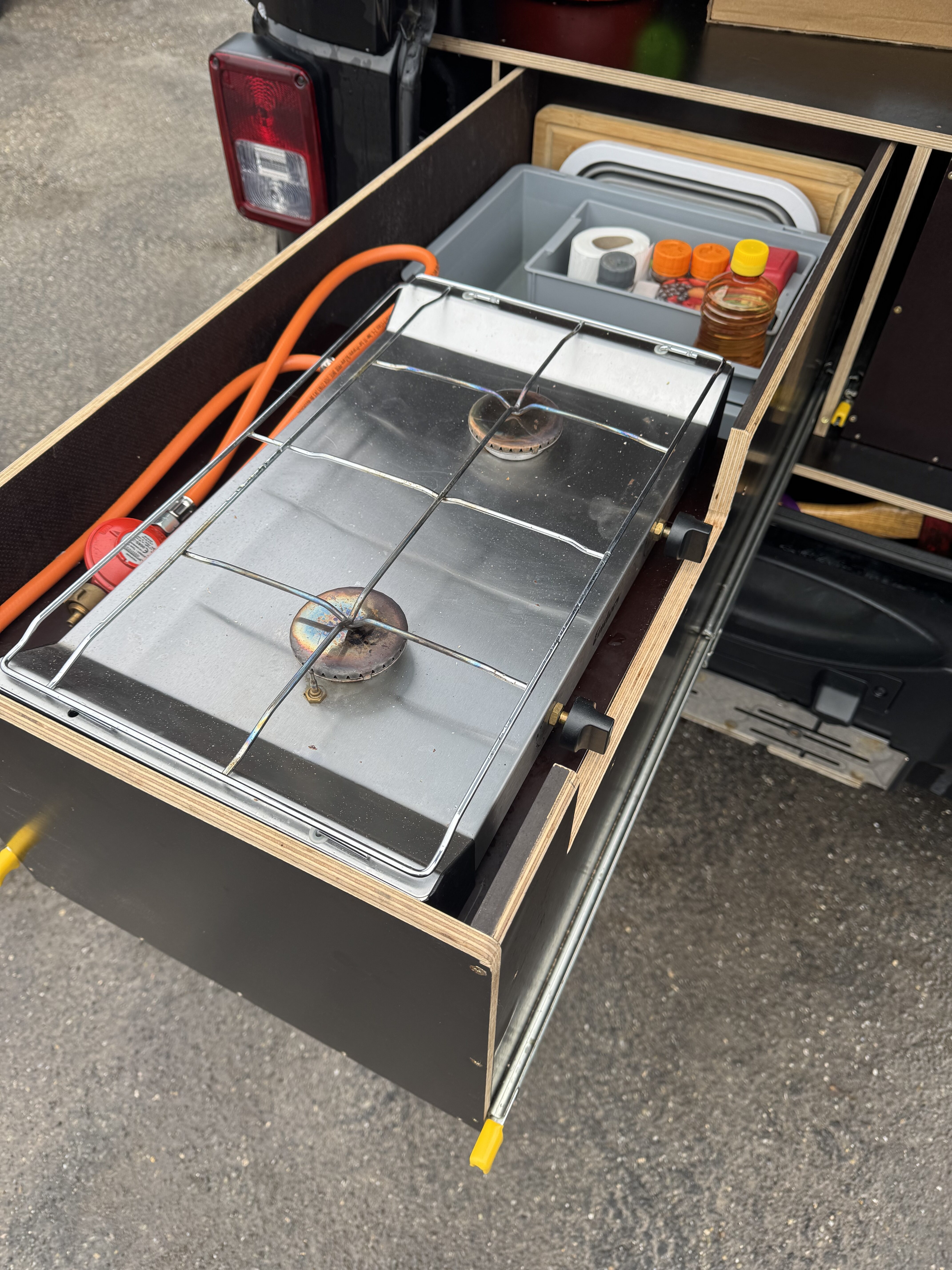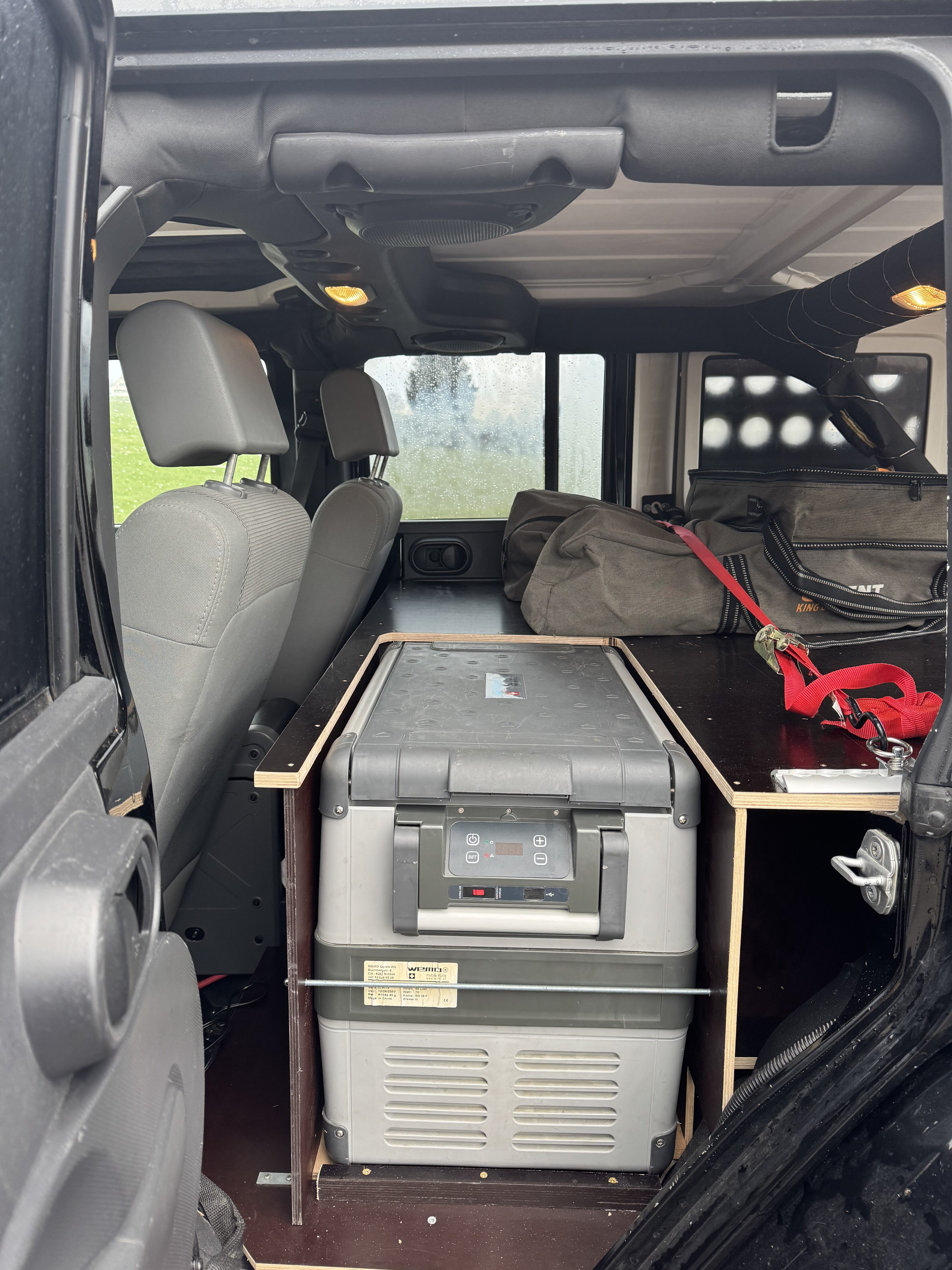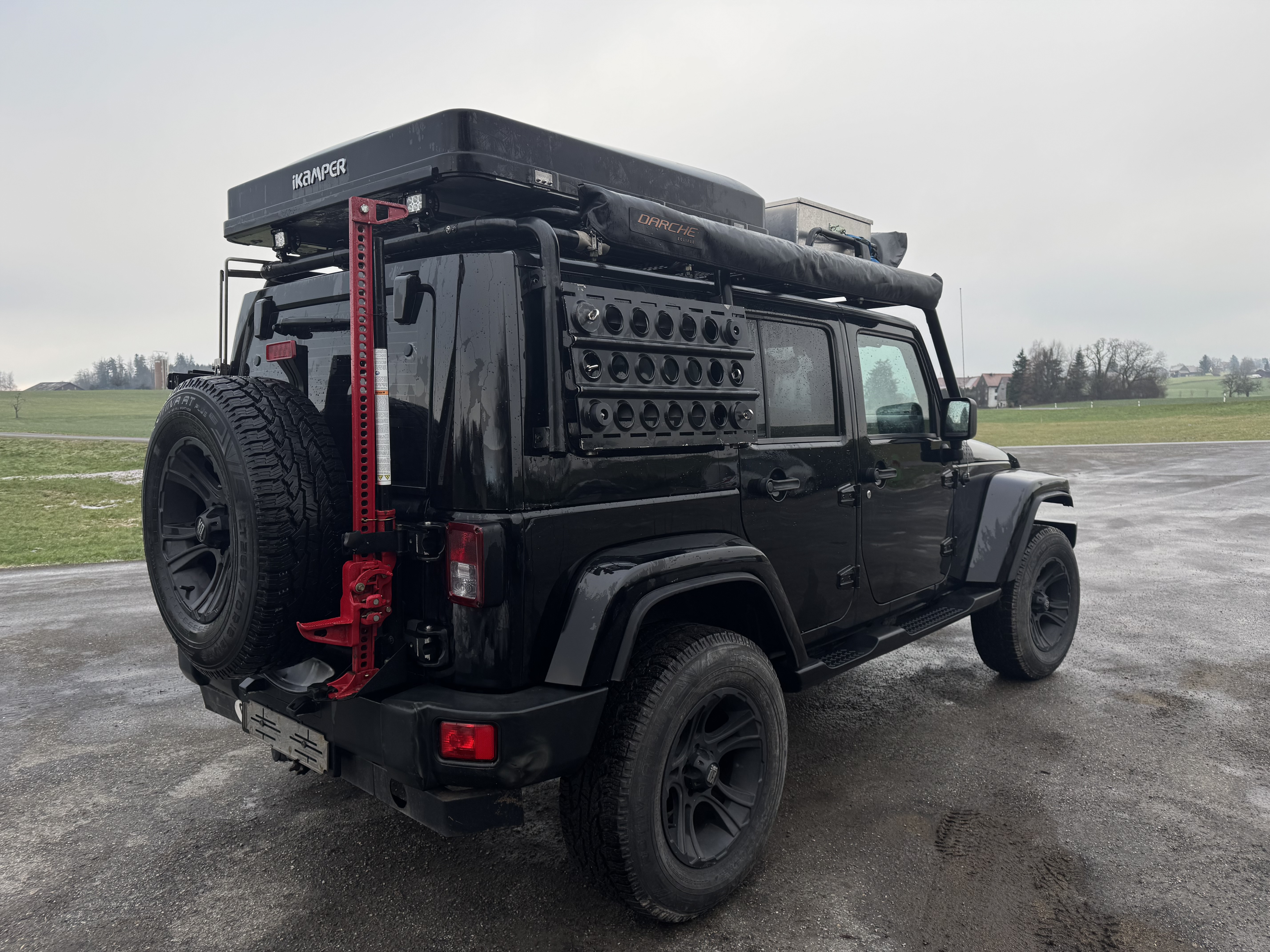 Il s'agit d'une Jeep avec 125'981 km, qui a été démontée par nous et le propriétaire précédent. Il ne reste que les sièges du conducteur et du passager, car tout l'espace arrière a été démonté. Dans le coffre se trouve la cuisine et un autre tiroir extensible. La glacière est intégrée à l'ensemble du montage, mais peut être rapidement démontée. Il y a également un bidon d'eau fraîche de 20 l, avec un support adapté.