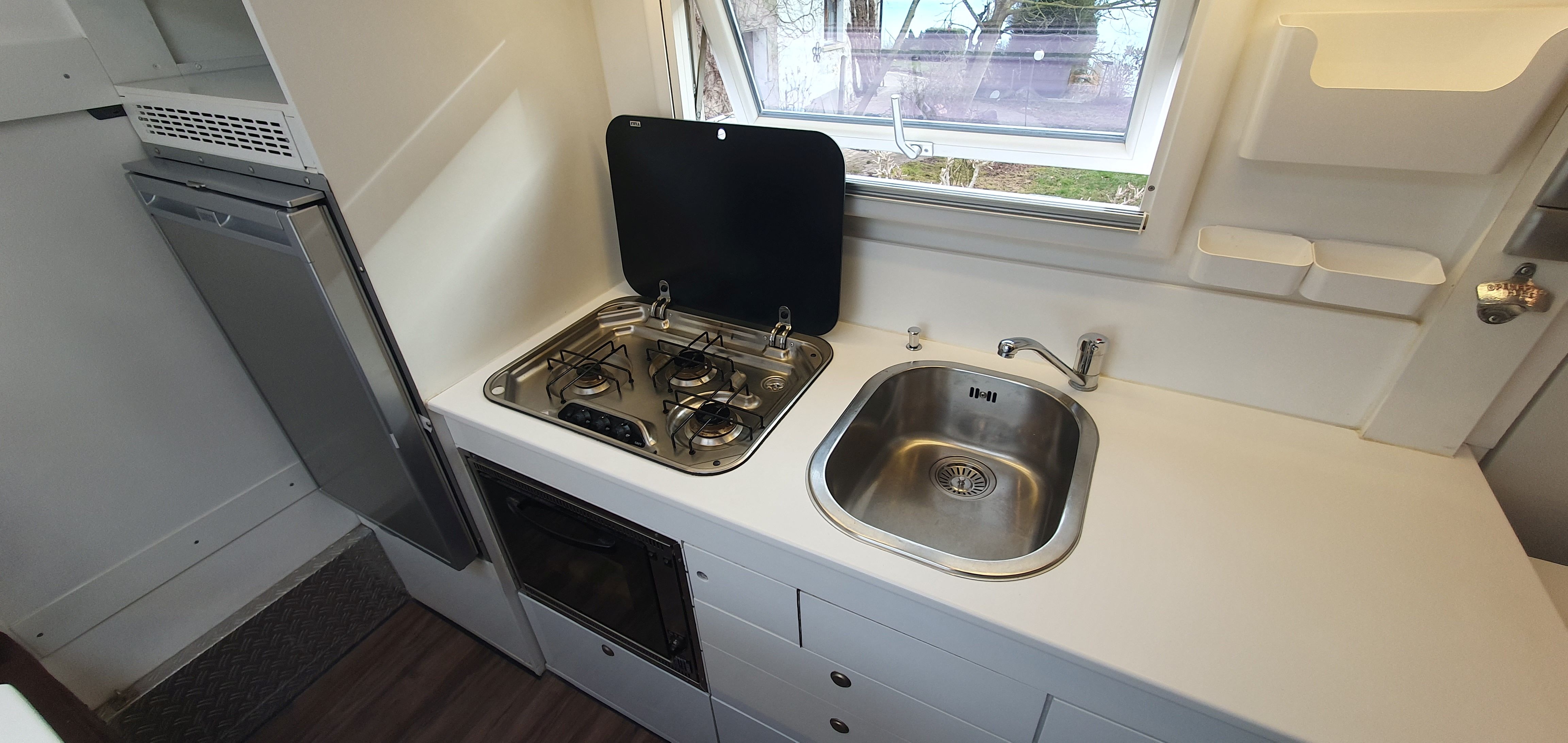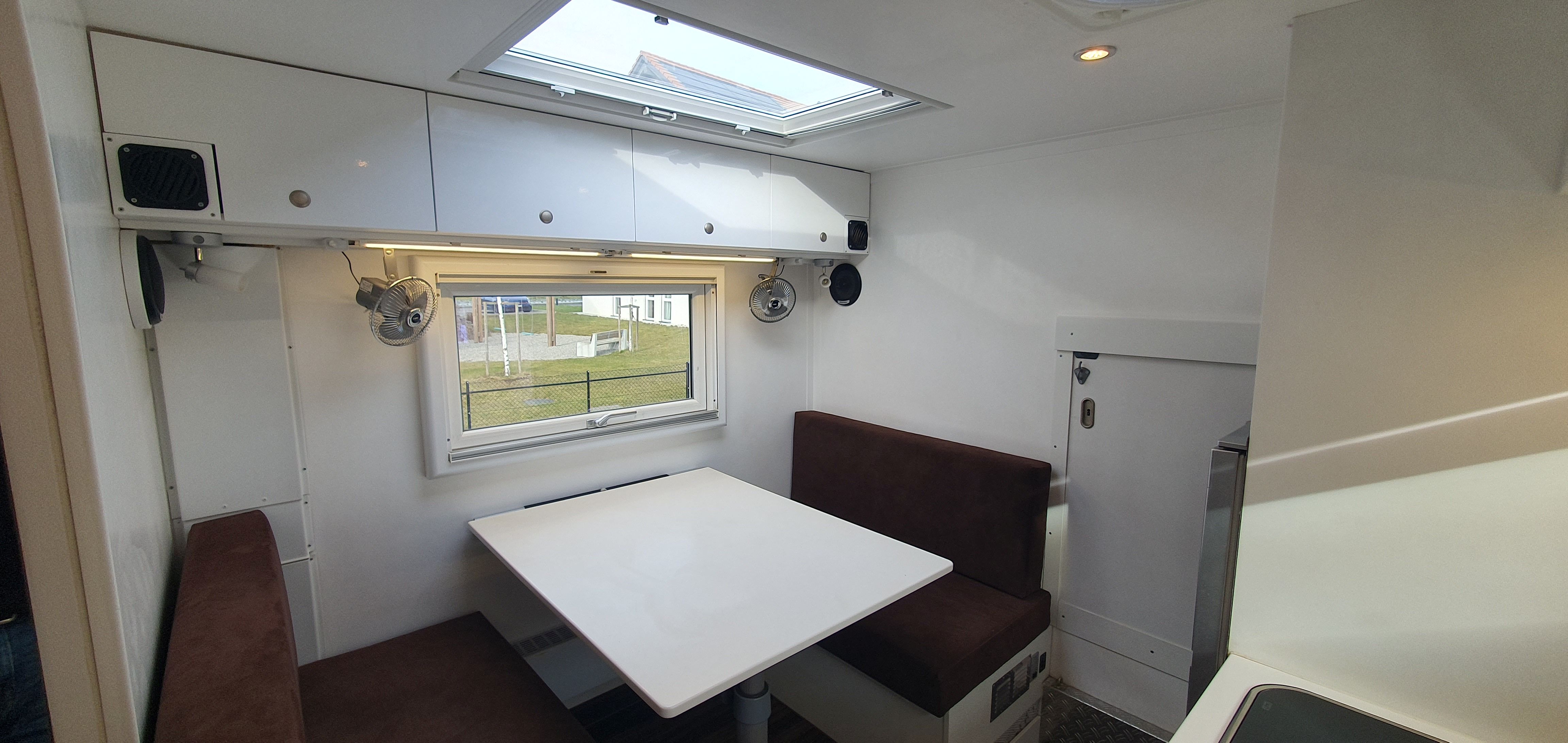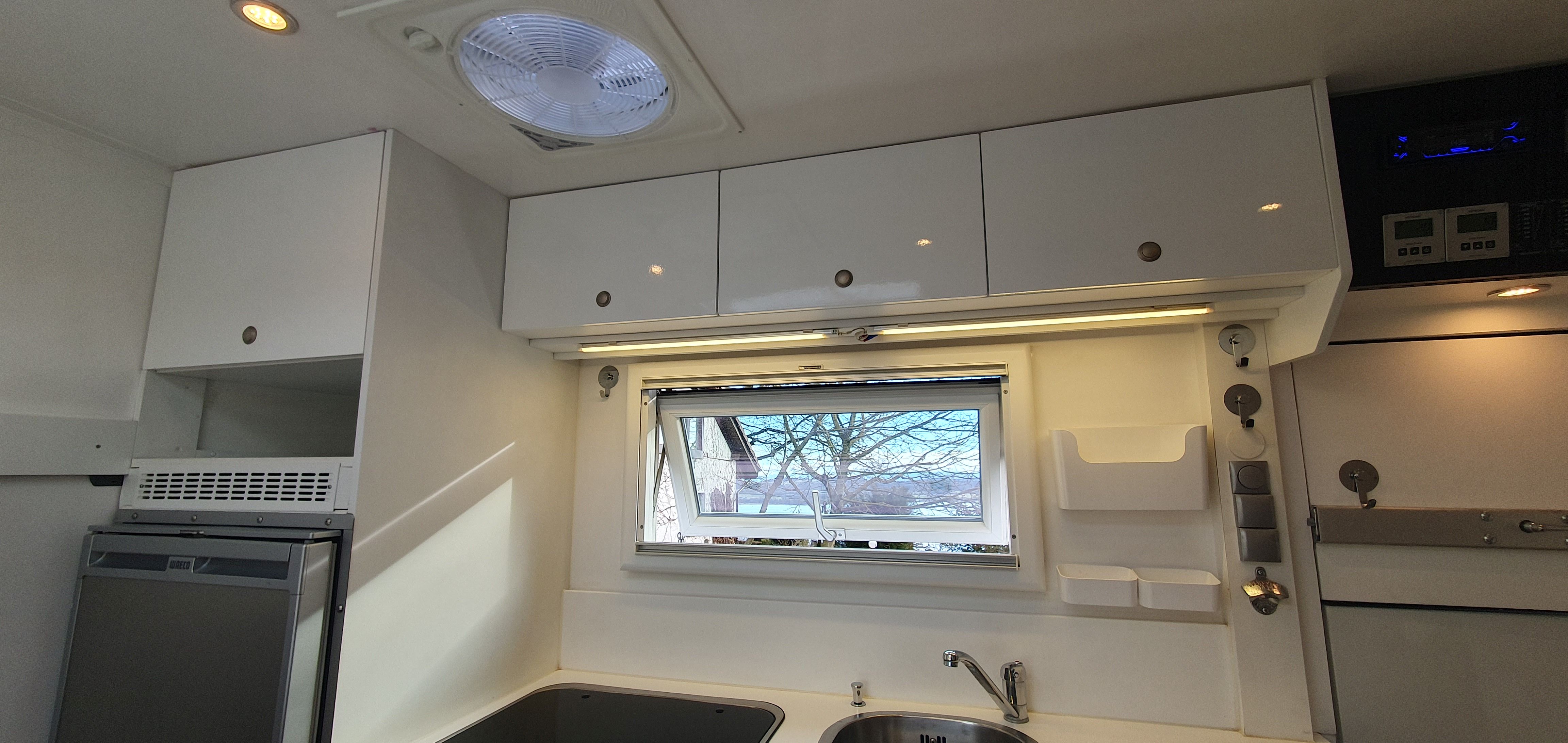 La carrozzeria è realizzata in vetroresina full sandwich. Il tetto e le pareti hanno uno spessore di 60 mm. I finestrini in vero vetro KCT con zanzariera e oscuranti sono molto robusti. L'accesso al tetto avviene tramite un ampio portellone sopra il letto. L'area di seduta è dotata di 4 sedili con eleganti rivestimenti in pelle Alcantara. Un ulteriore lucernario fornisce molta luce alla cucina e alla zona giorno. Le porte, gli sportelli e i cassetti sono verniciati con una robusta vernice per auto di alta qualità e sono quindi molto facili da pulire; le pareti sono lavabili. La cabina è dotata di un passaggio per la cabina di guida. La cabina è facilmente accessibile tramite una scala estensibile elettricamente. Un grande specchio nella zona d'ingresso e uno nella camera da letto danno una maggiore sensazione di spazio. L'ampio garage posteriore con verricello e rampa d'accesso offre spazio per un quad, una moto o una bicicletta, oltre a un box per le attrezzature.