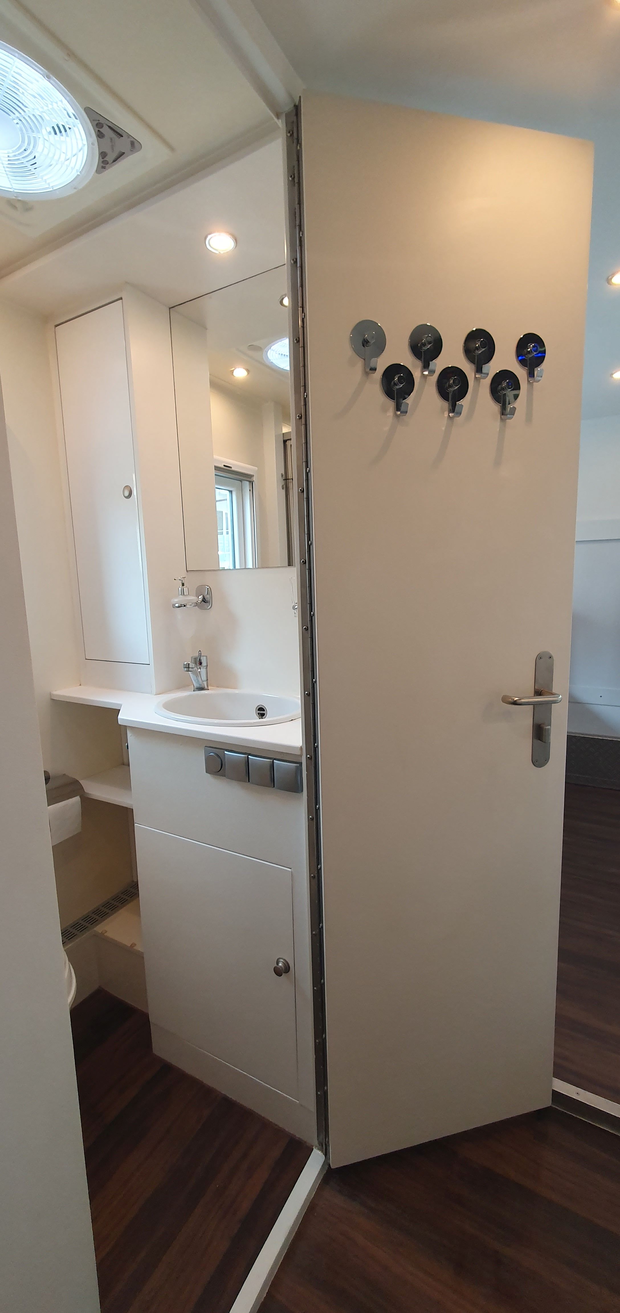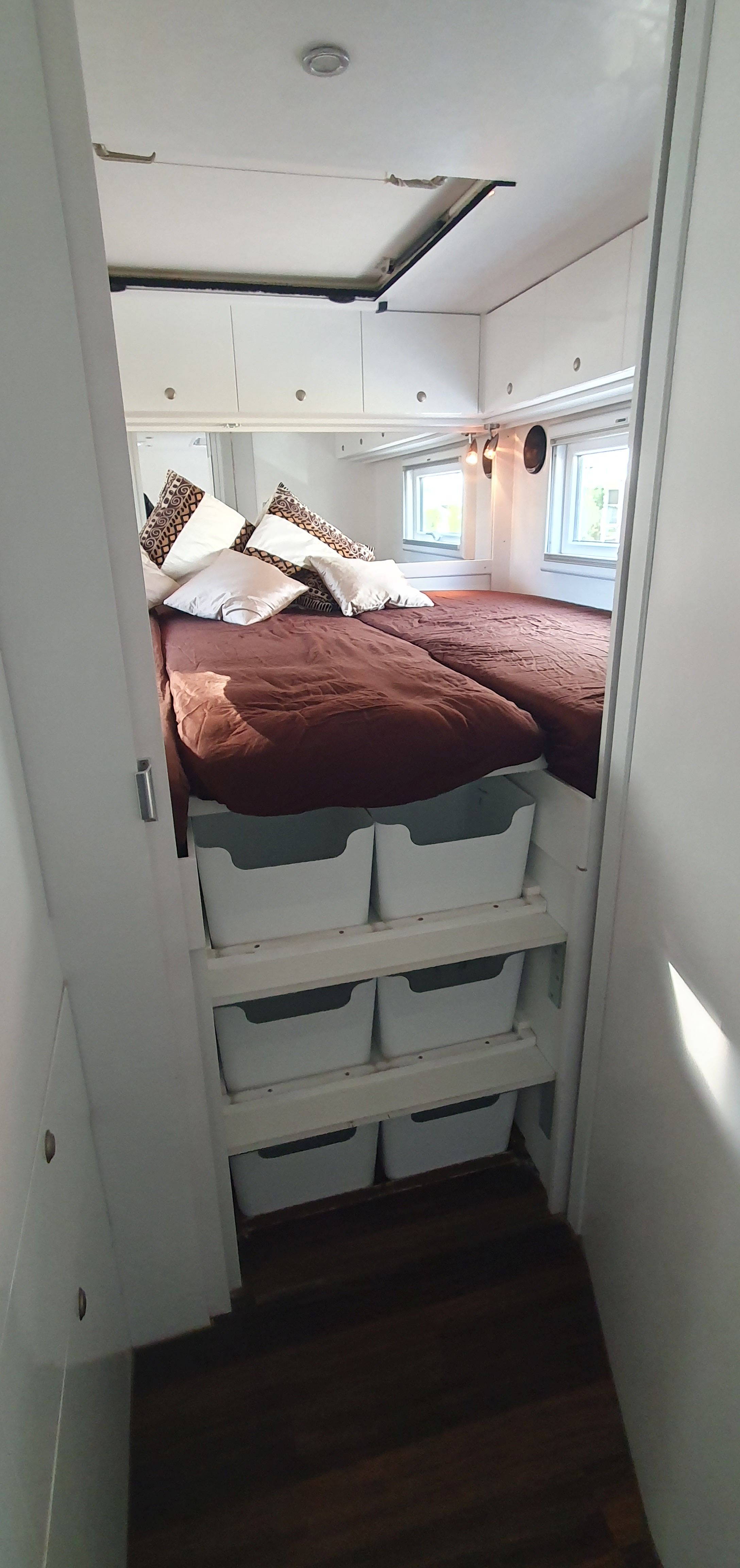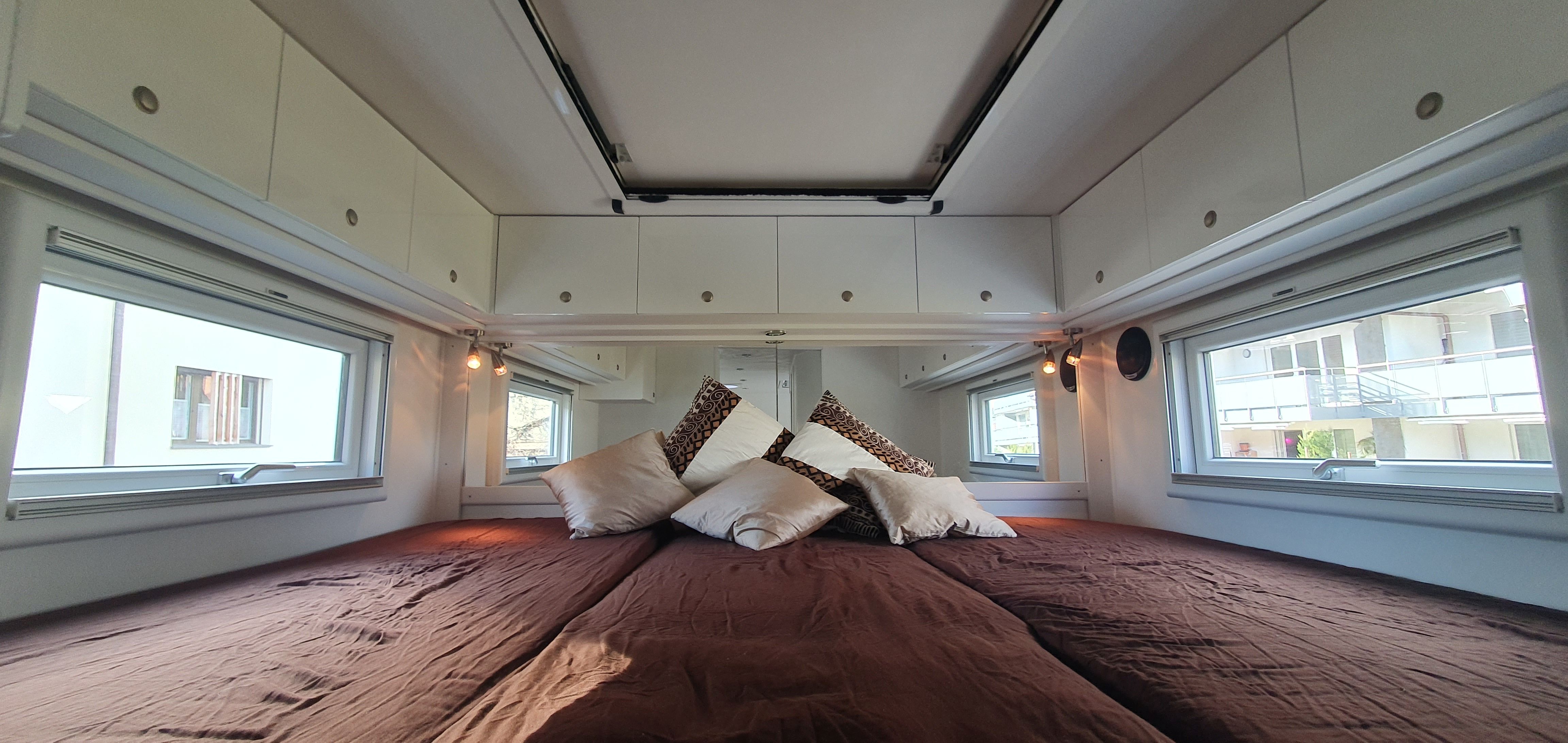 Il comfort è assicurato anche dai due letti da 200 x 80 cm in direzione longitudinale del veicolo con reti a doghe regolabili. Un terzo materasso tra i due letti li collega per formare un'area prendisole.