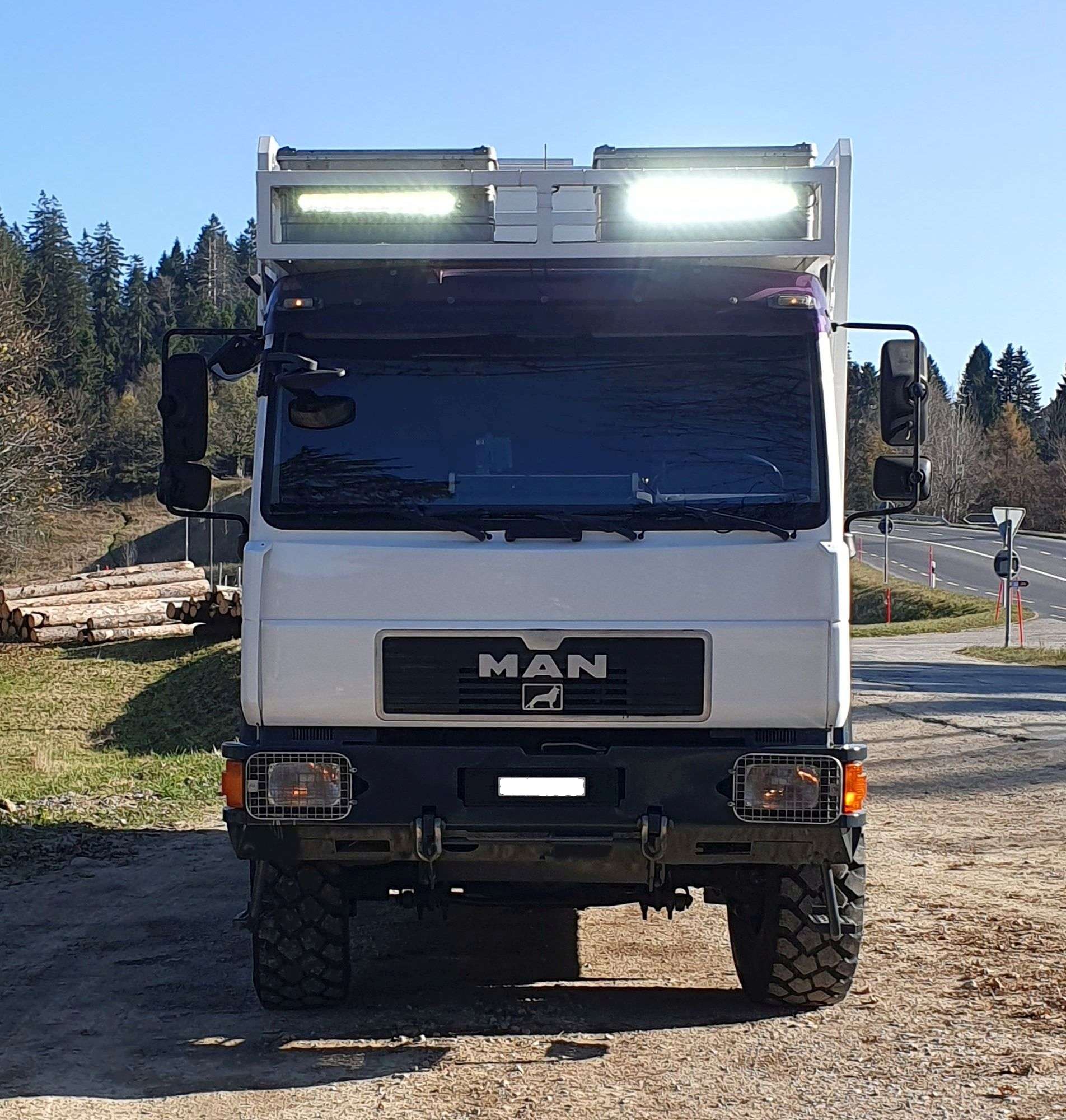 MAN 10.224 LAEC (LE2000), 4×4, motore 6 cilindri Euro 2 da 6,9 litri, 220 CV, peso lordo 10,8 tonnellate, passo 4050 mm, cruise control, aria condizionata, sistema video di retromarcia, sollevatore posteriore per 2 ruote e 4 vaschette per la sabbia. Due grandi fari supplementari a LED illuminano la parte anteriore del veicolo con luce naturale.