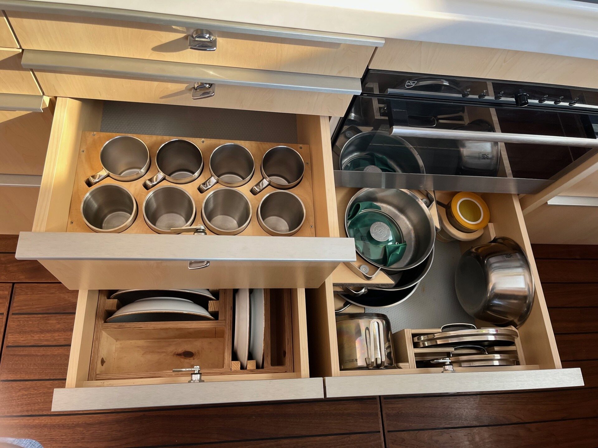 - Pentole 🍳, piatti e tazze sono conservati in modo sicuro sulle pendenze