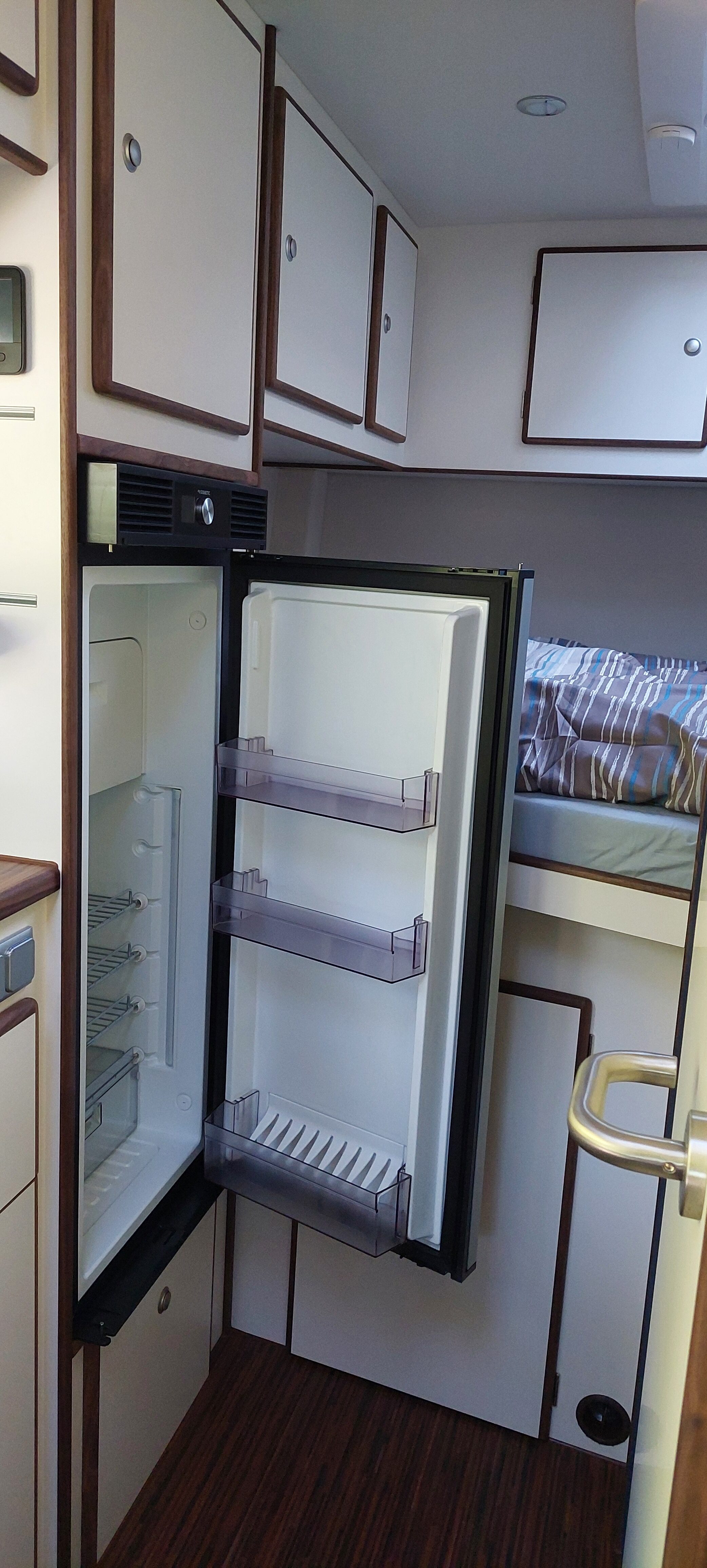 - Frigorifero a compressore 90 l (apertura su due lati), acqua dolce 100 l + altri 60 l sotto il pavimento
