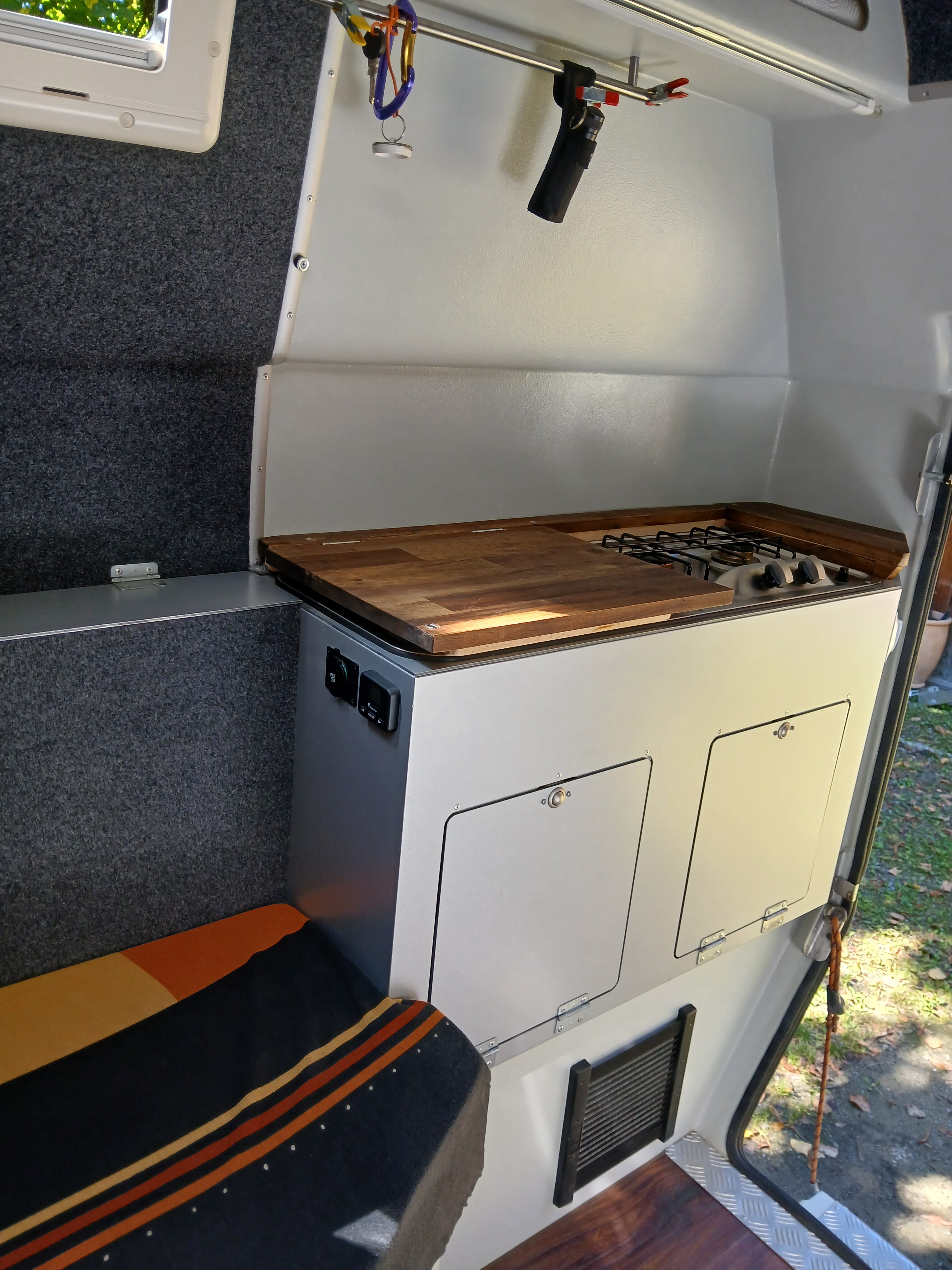 - Küche & Wasser: 50-Liter-Wassertank mit Pumpe und Wasserhahn, Spüle und 2-Flammen-Kocher von Dometic