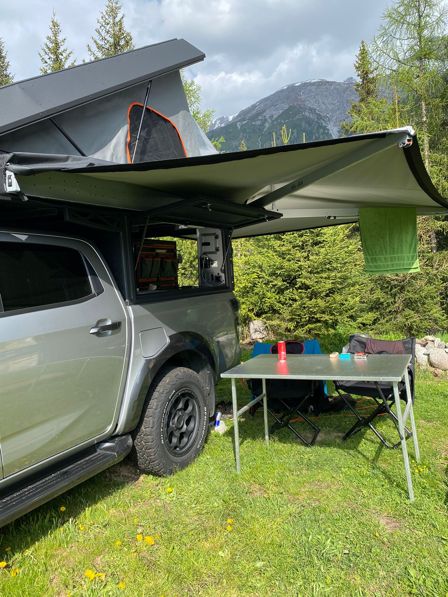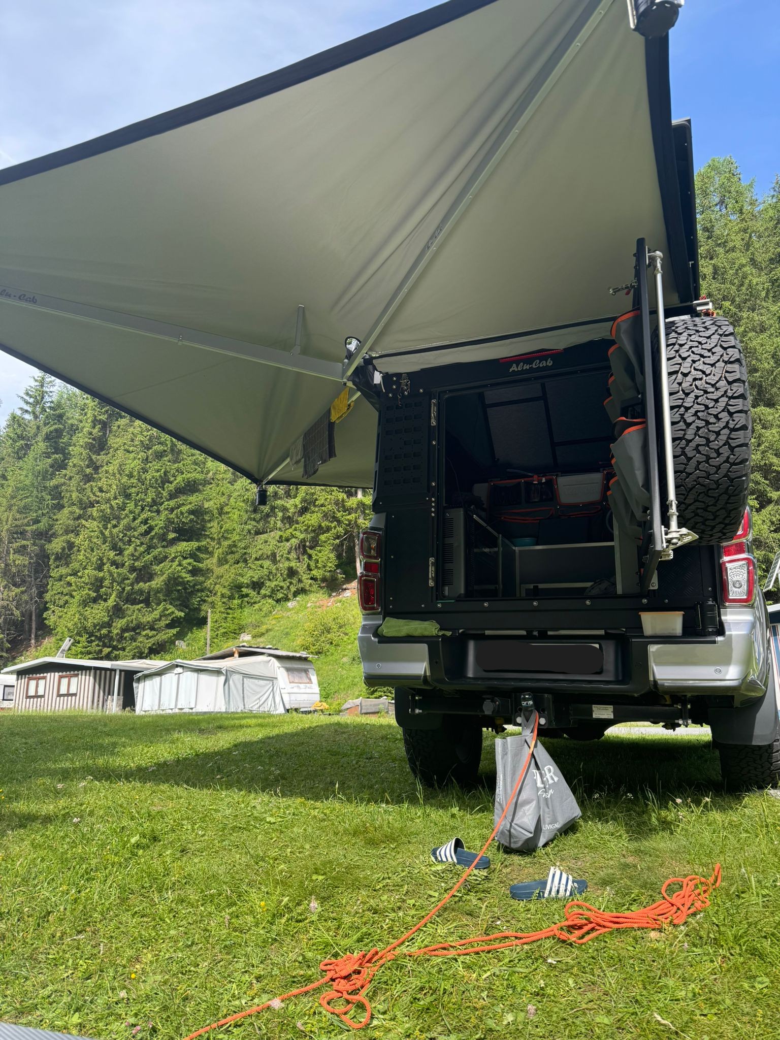 • Die Alu-Cab Wohnkabine ist mit einer praktischen 270°-Markise (Alu-Cab) ausgestattet, die dir viel Schutz und Flexibilität im Freien bietet. Zudem ist ein passender Campingtisch von Alu-Cab vorhanden, der ideal und Platzsparend unter dem Dach der Wohnkabine verstaut wird. So bist du bestens für gemütliche Stunden draussen gerüstet.