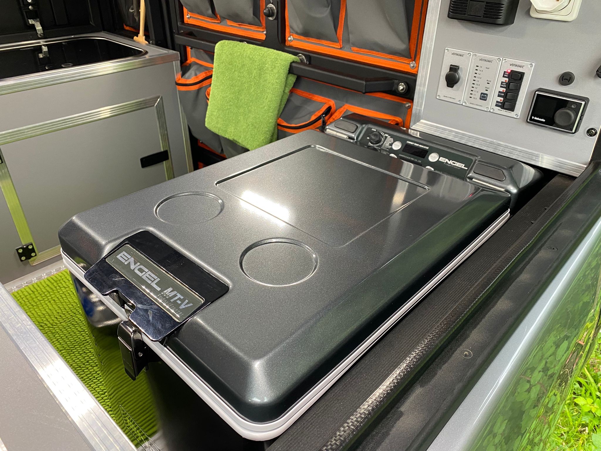 • Engel Kompressor-Kühlschrank auf praktischem Klicksystem montiert, kann schnell herausgenommen und draussen genutzt werden