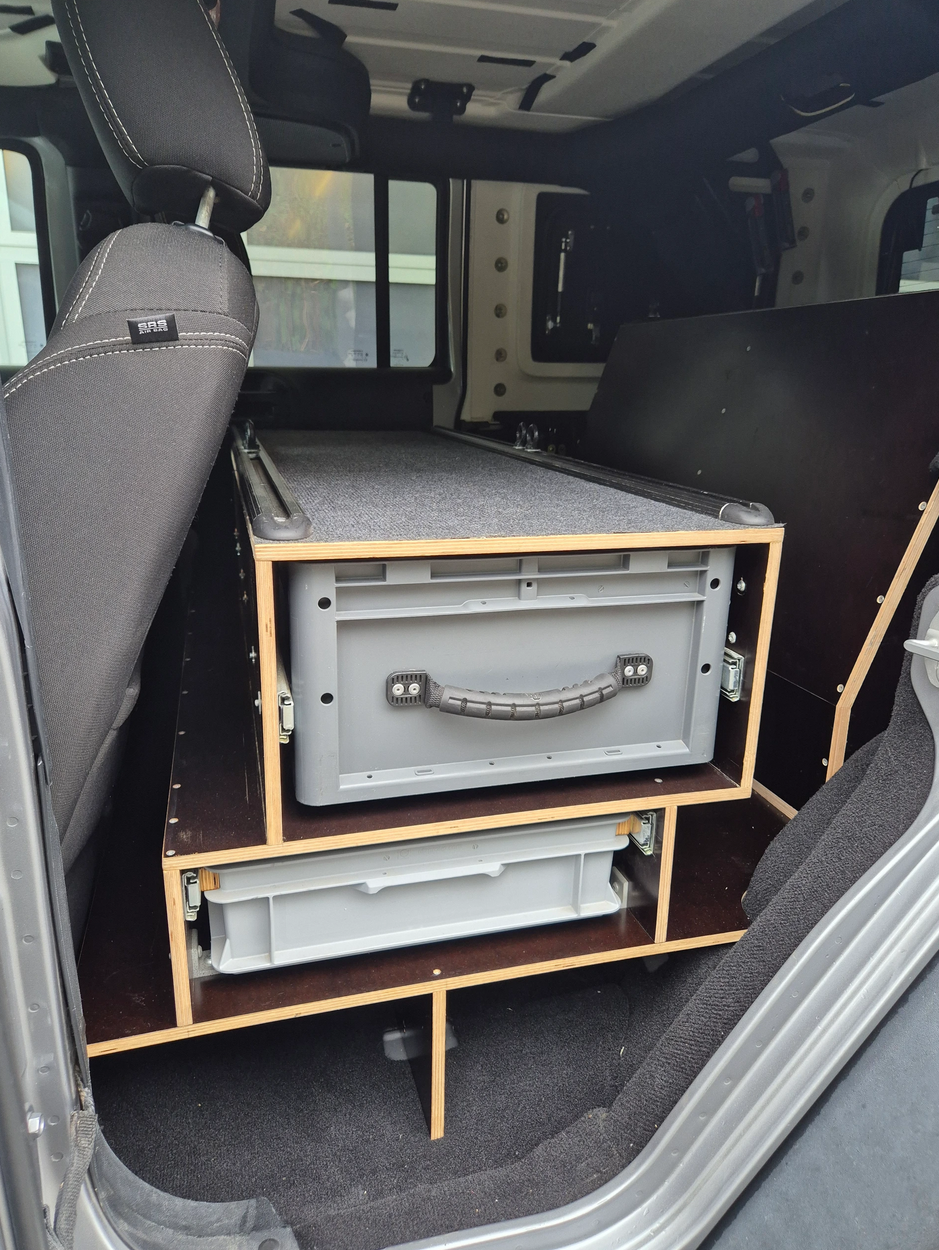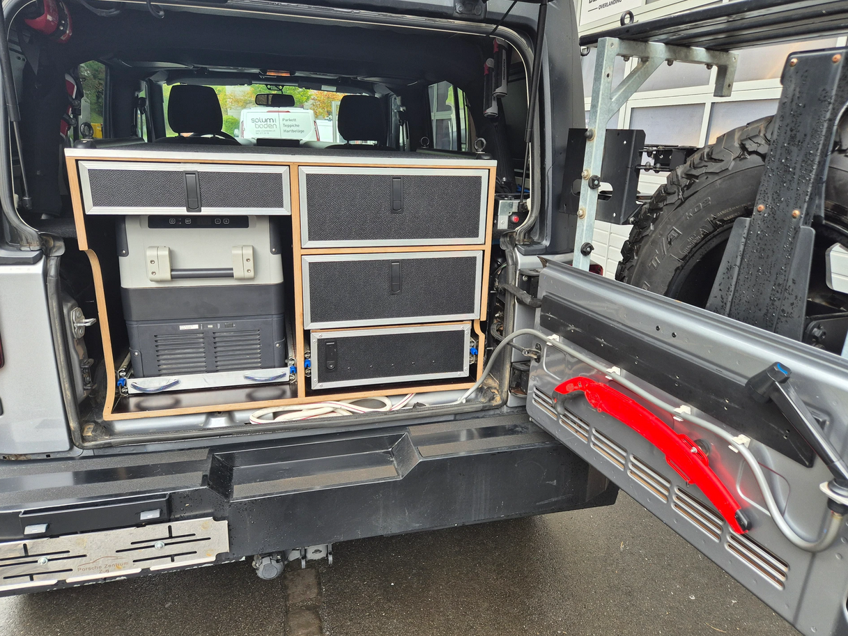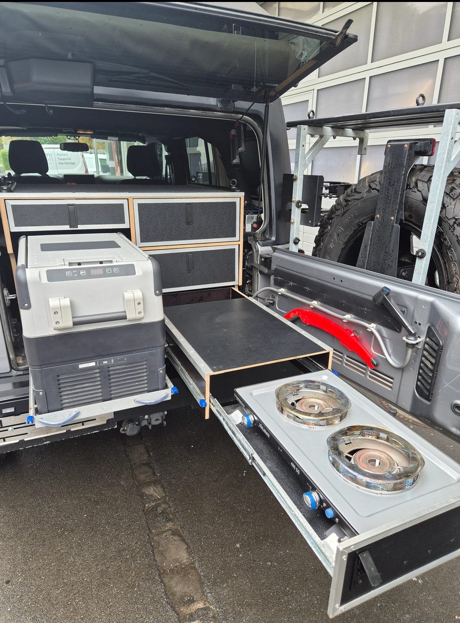 • Massgefertigte Heckküche mit Dometic CFX40 Kompressorkühlbox & 2-flammigem Rechaud