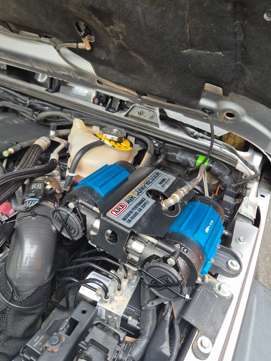 • ARB Doppelkolbenkompressor (Motorraum), Anschluss und Bedienelement unter Fahrersitz