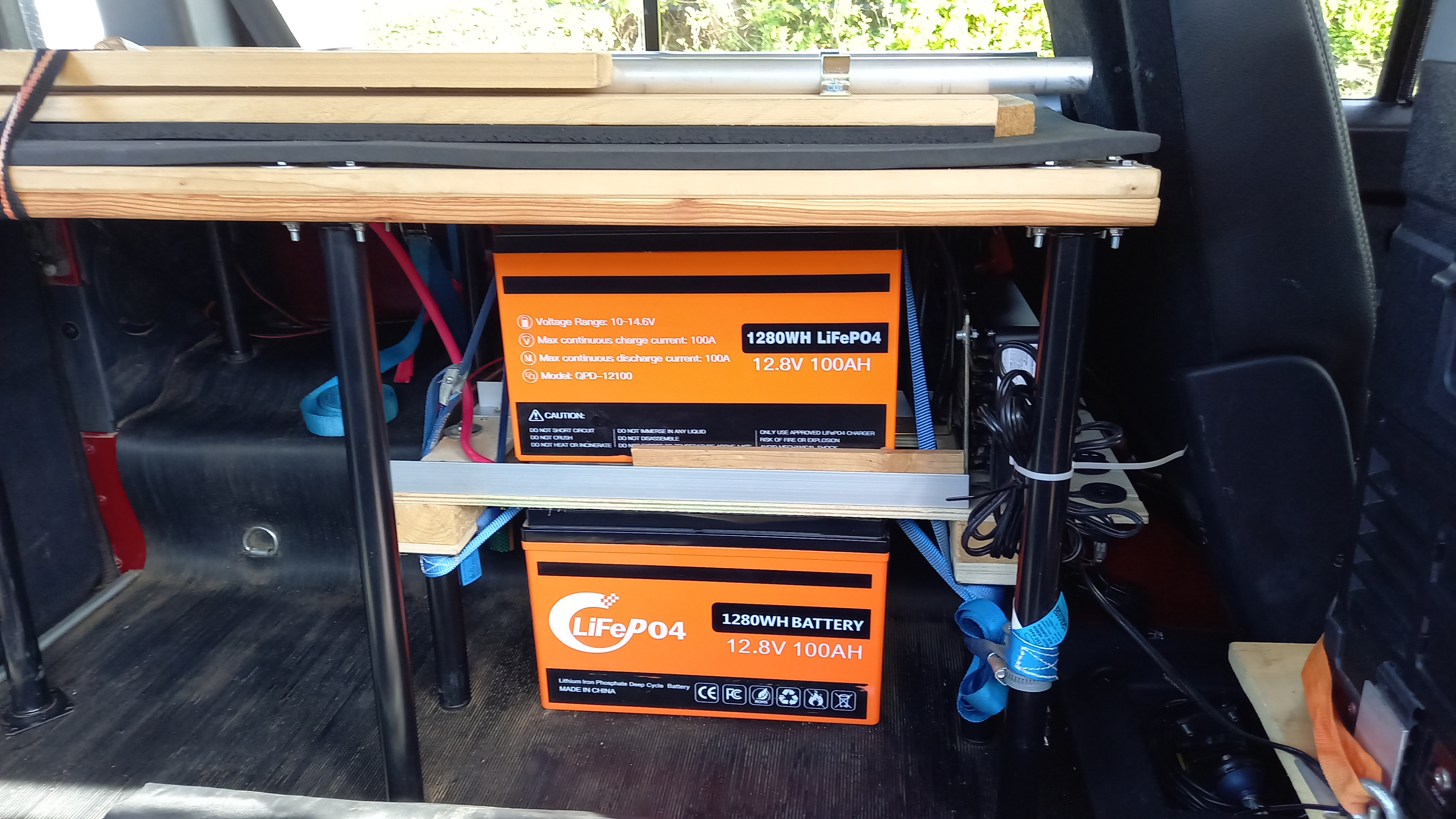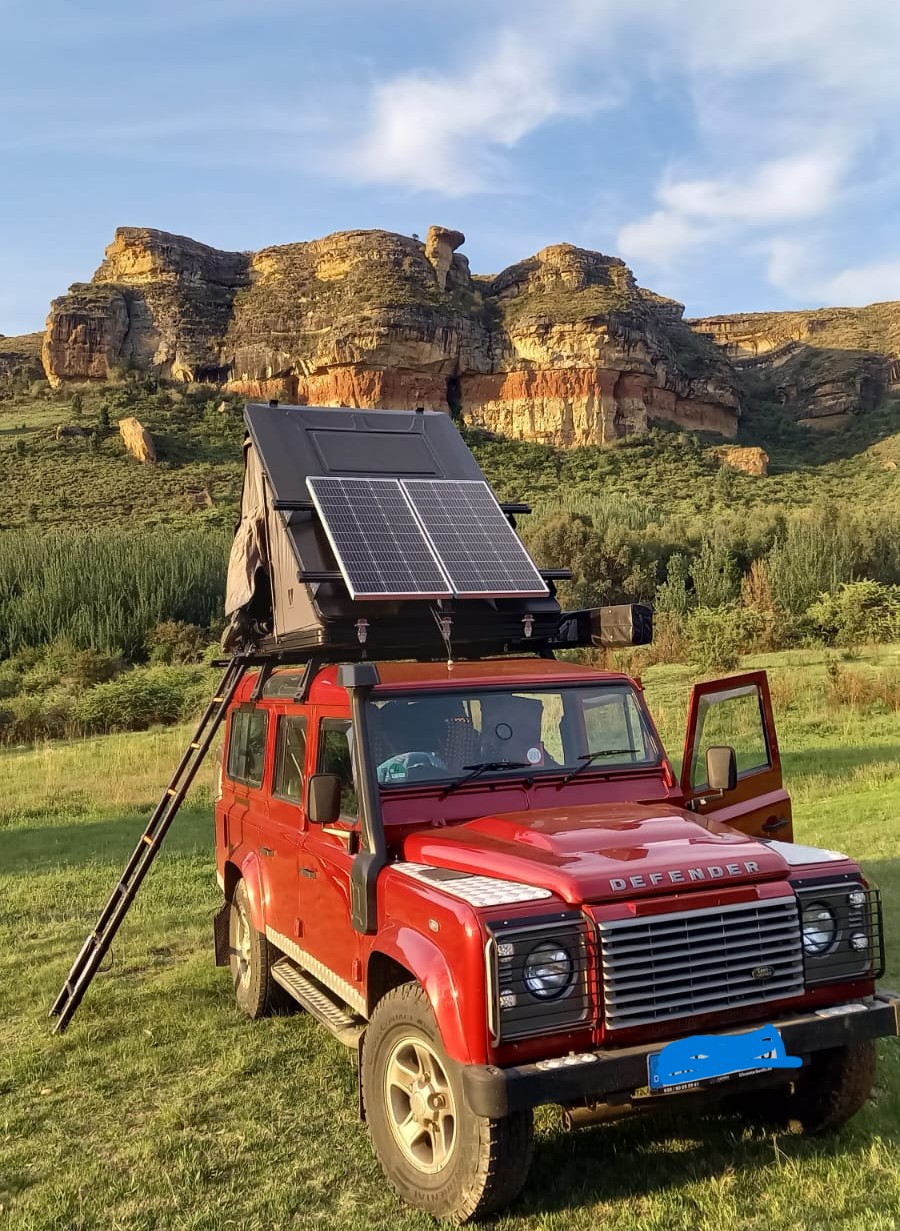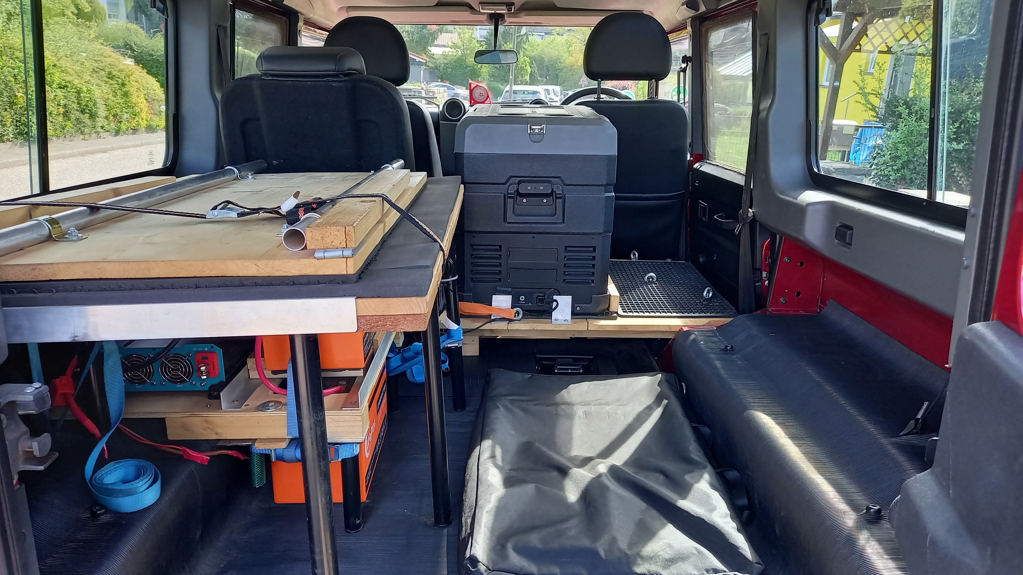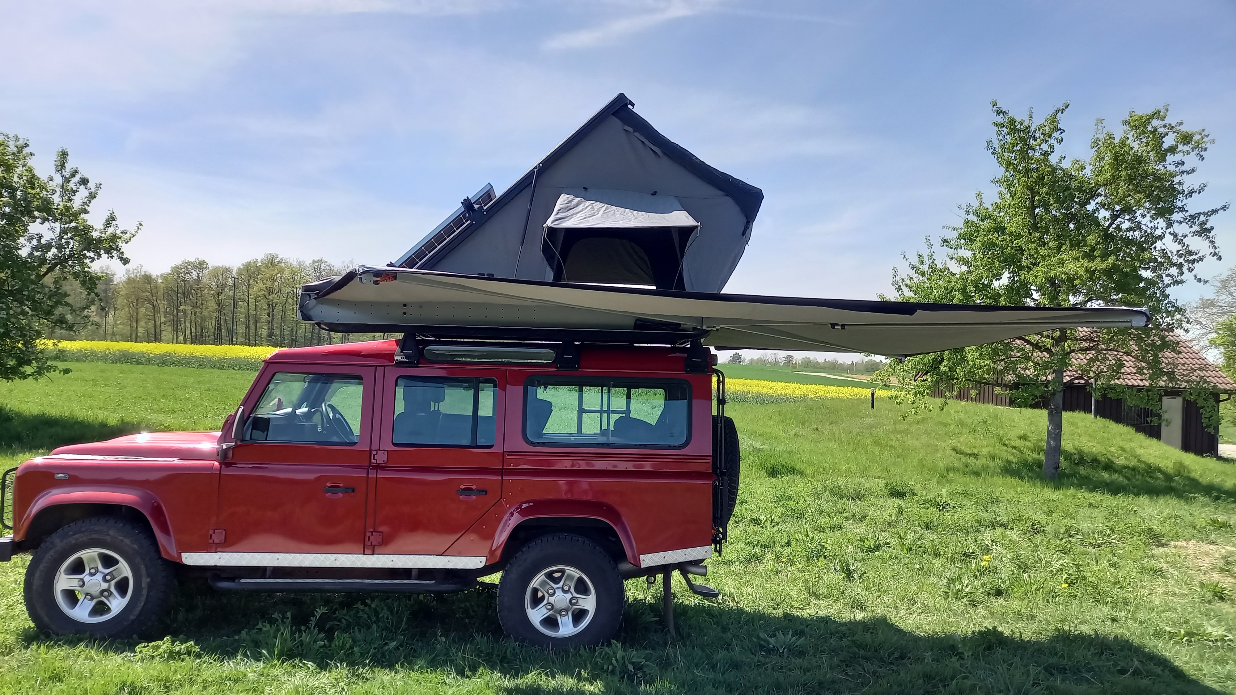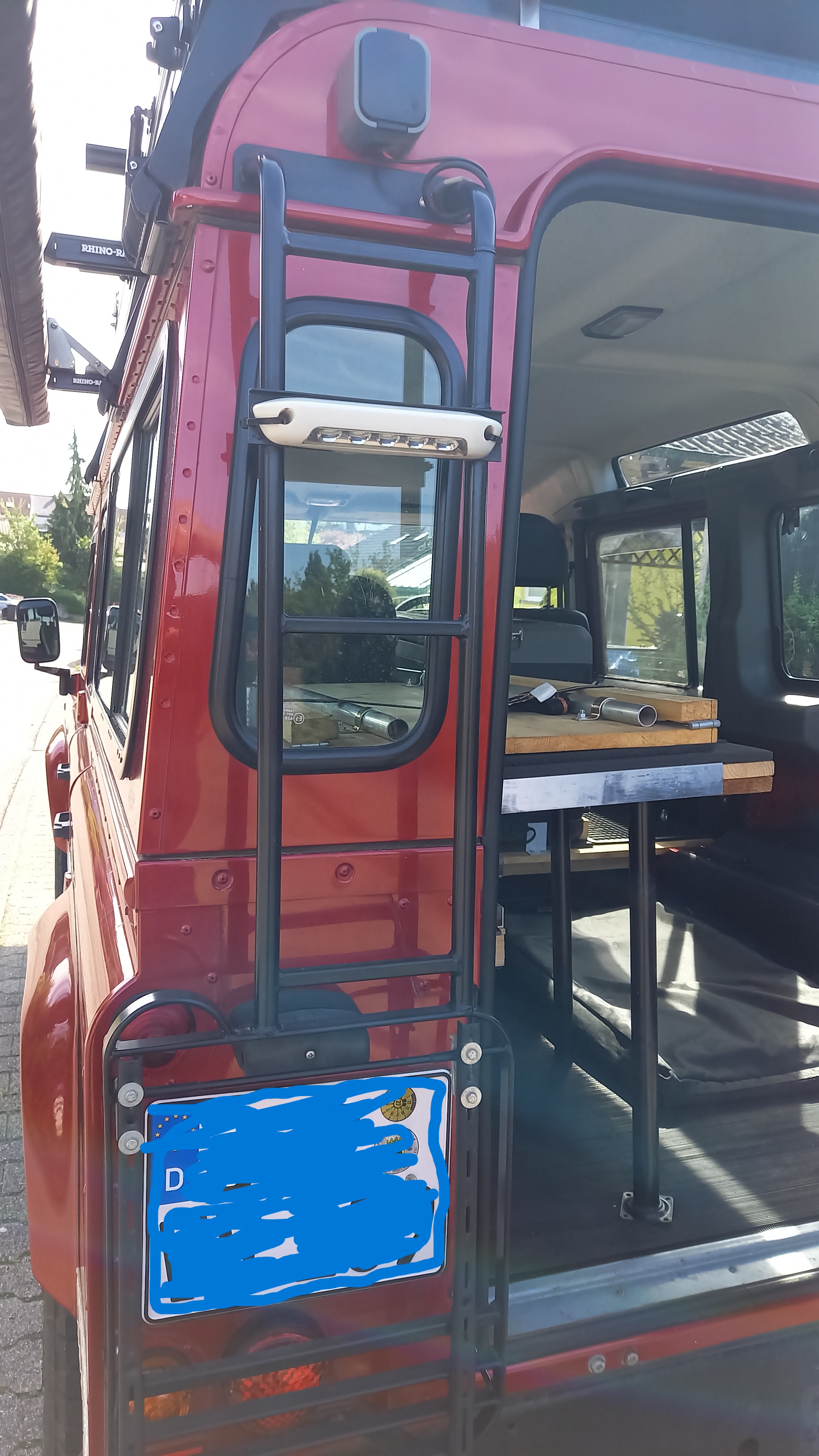 3 heavy duty racks (rhino), Dachzelt (Vickywood), Markise 270° (alu-cab), 2 PV-Platten je 100 WP, 2 Batterien je 1 kWh, Umformer 12V-220V (3000W), Kühl-/Gefrierbox auf Halterung mit Befestigungsmöglichkeiten für zwei Jerrycans sowie Wasserkanister, Außenleuchte 12V, Außensteckdose 220V, Halterung für Außenküche, extra Liegefläche im Auto.