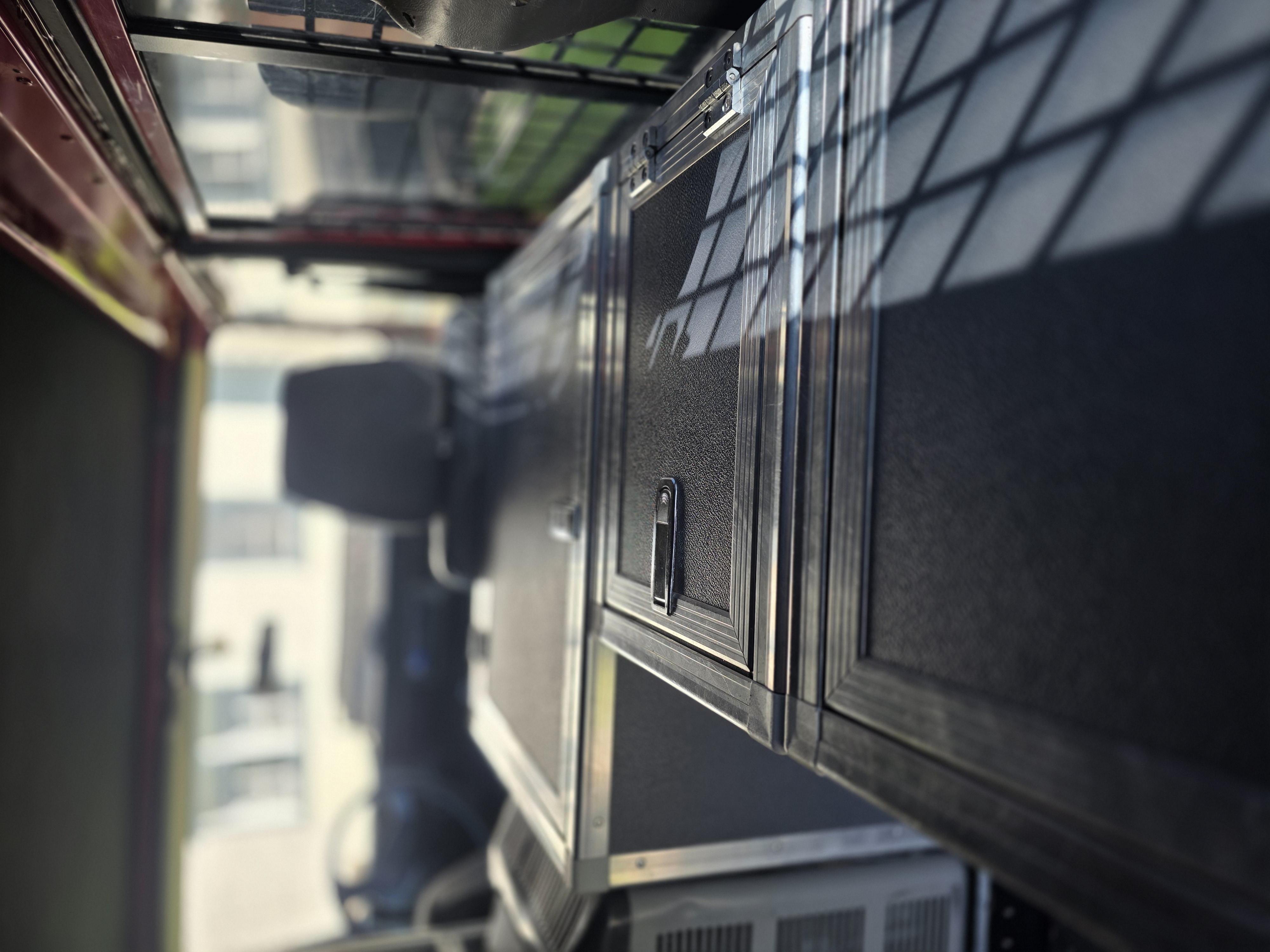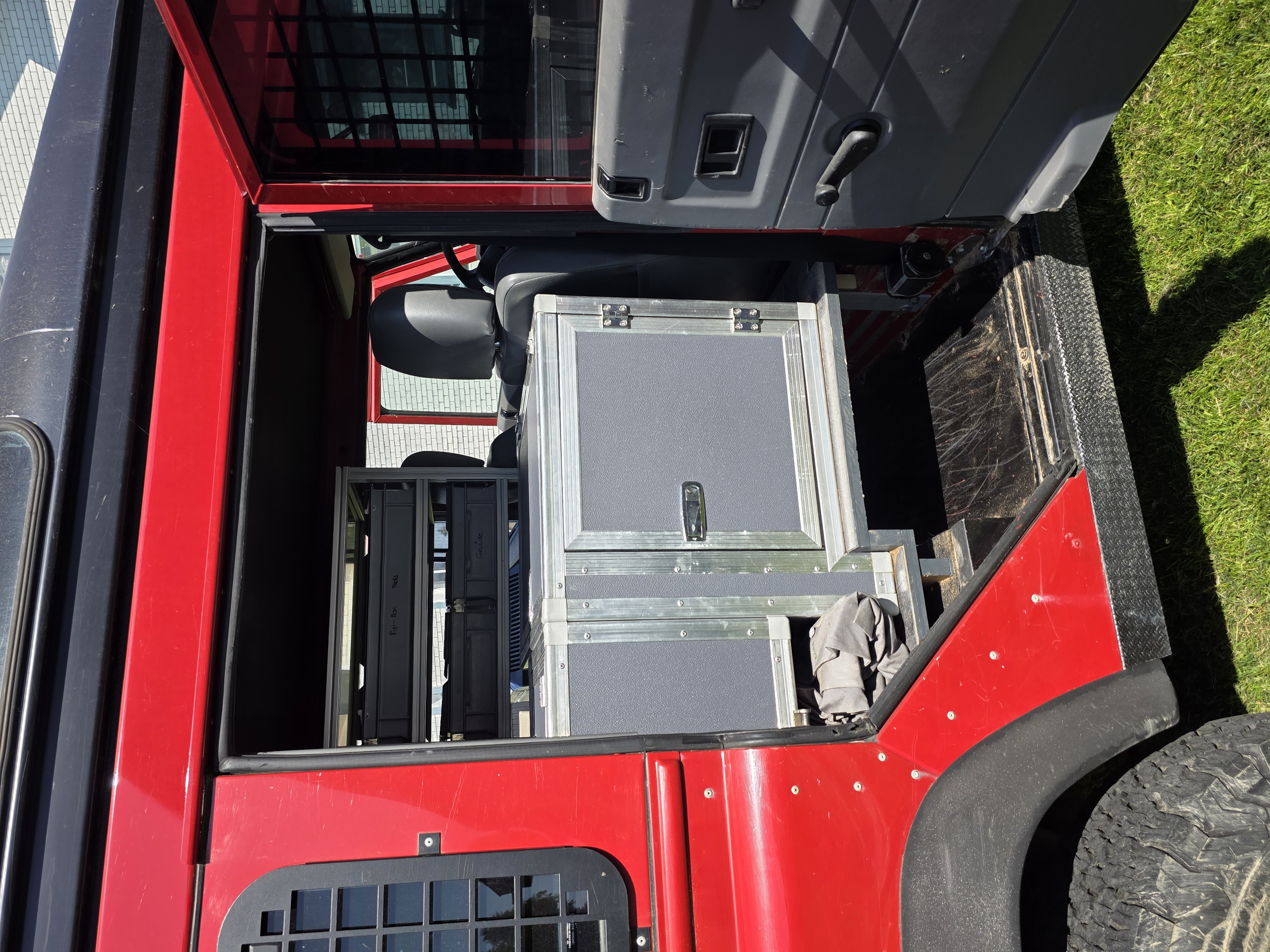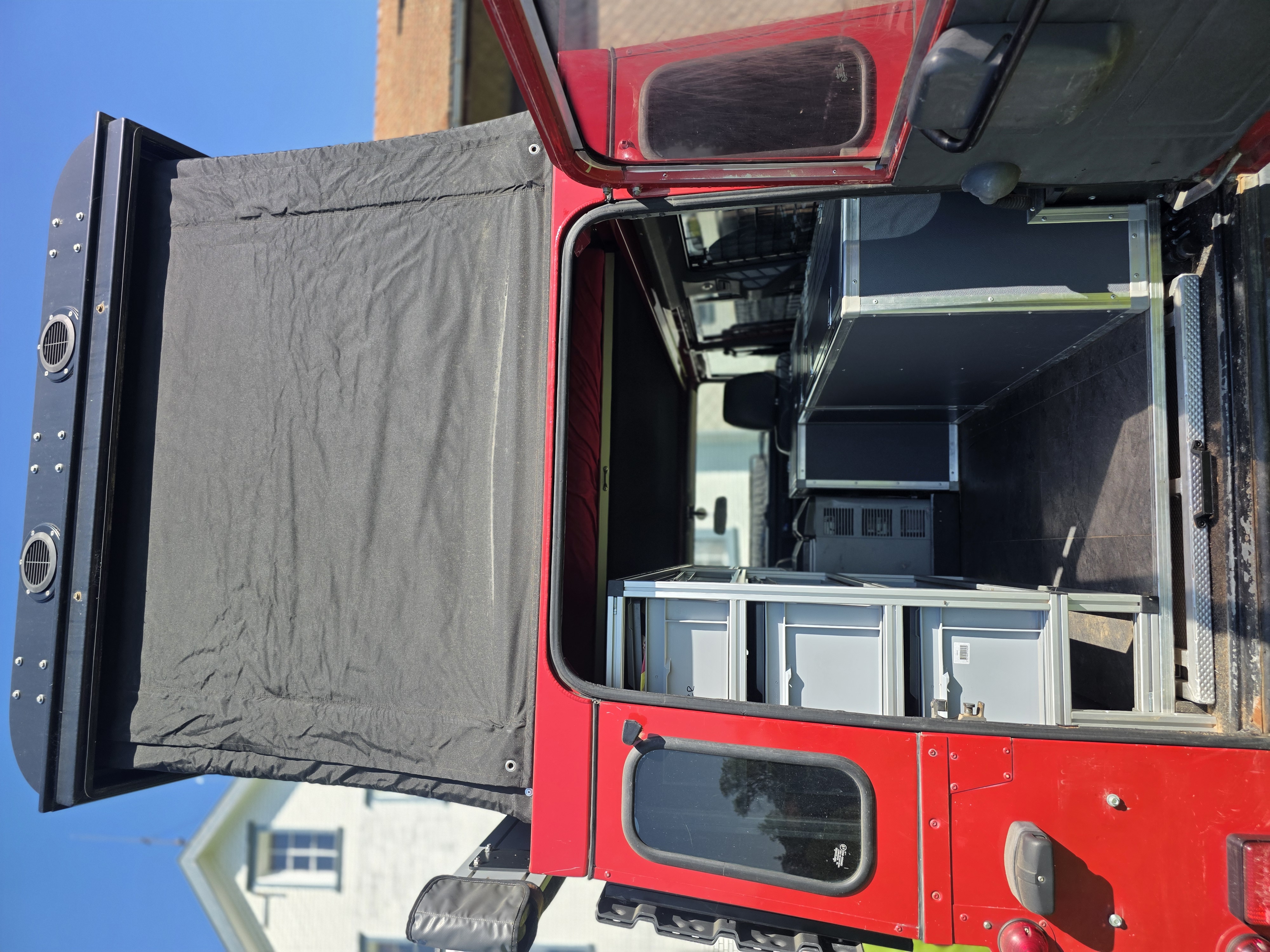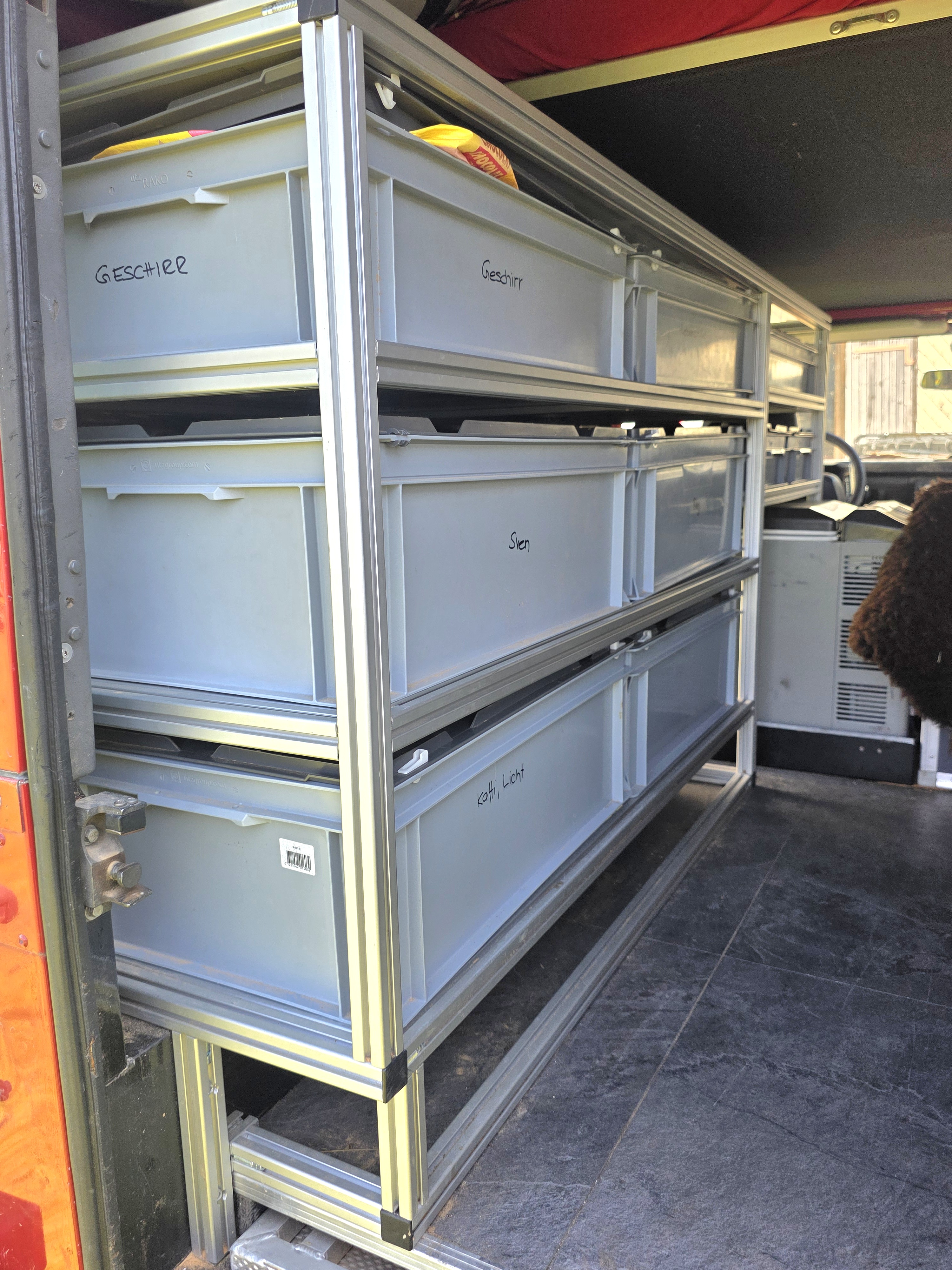 2 Sandbleche klappbar und abschliessbar auf der Linken Seite, welche auch als Stehtisch heruntergeklappt werden können