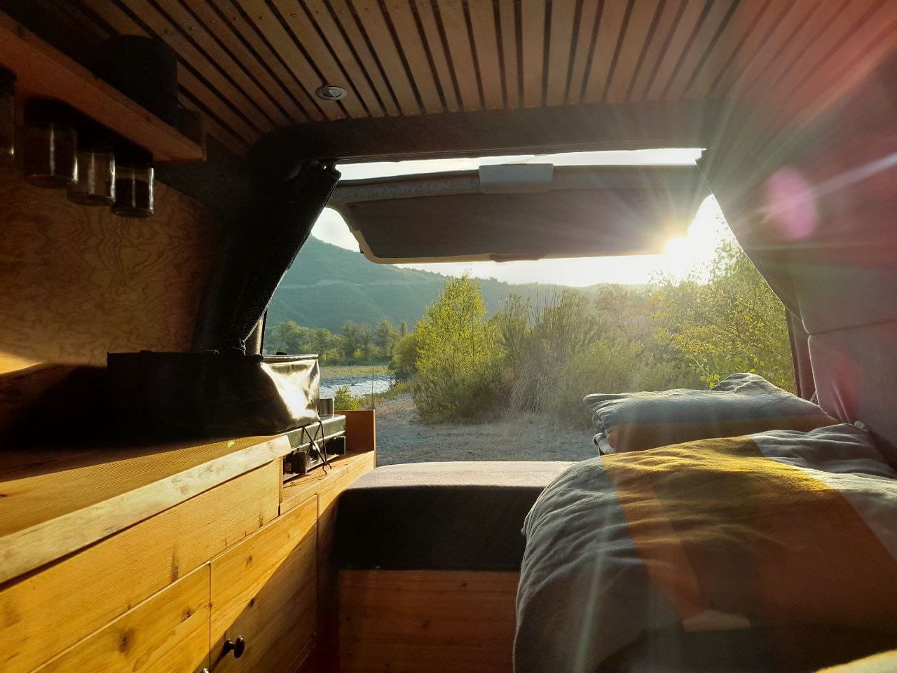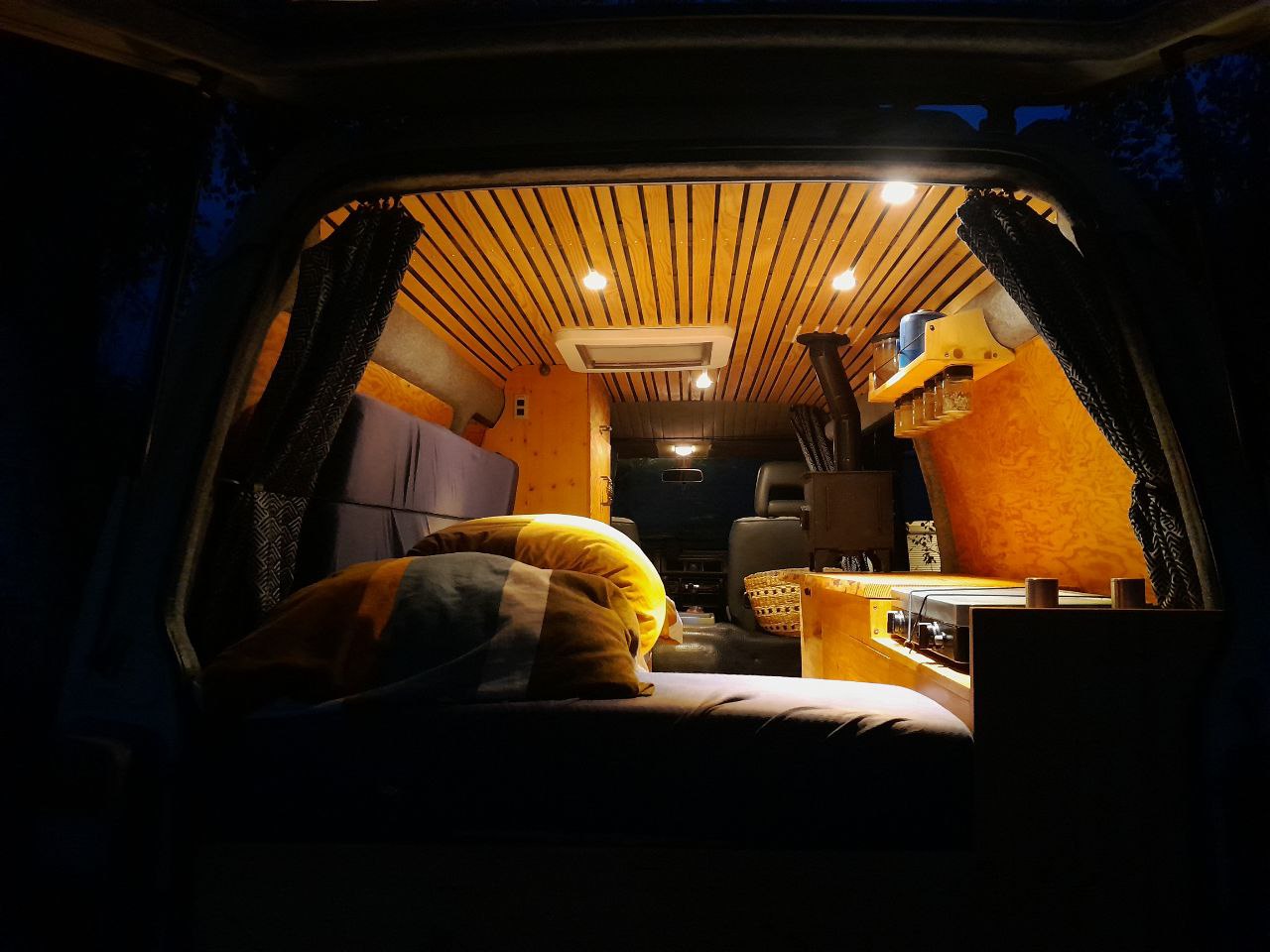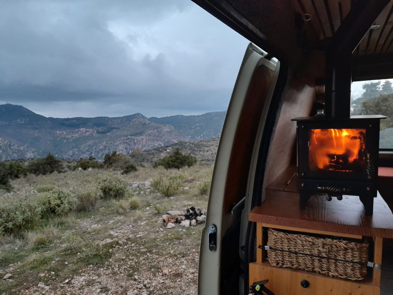 Highlight ist der Holzofen von Tiny-Stove, extra für Campervans konzipiert. Heizt den Raum schnell auf, trocknet nasse Kleidung im Nu und sorgt für ein unbeschreibliches Ambiente. Natürlich ist auch ein Gas- und Kohlenmonoxidmelder verbaut.