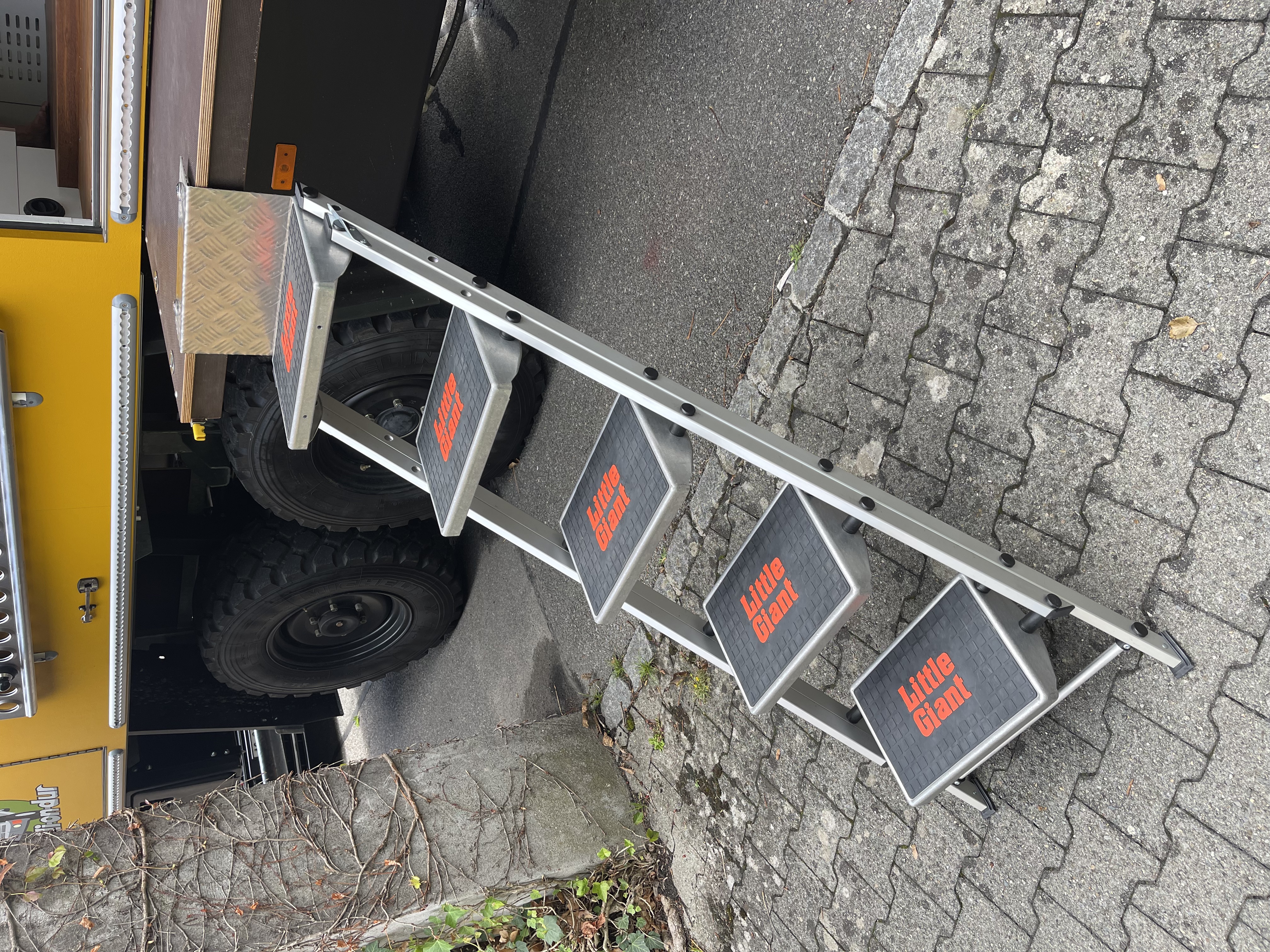 Treppen: 1 x Falttreppe von Little Giant in Alu in 2 Positionen am Podest fixierbar. Lagerort in Heckgarage / 1 Leiter für den schnellen Einsatz in Alu