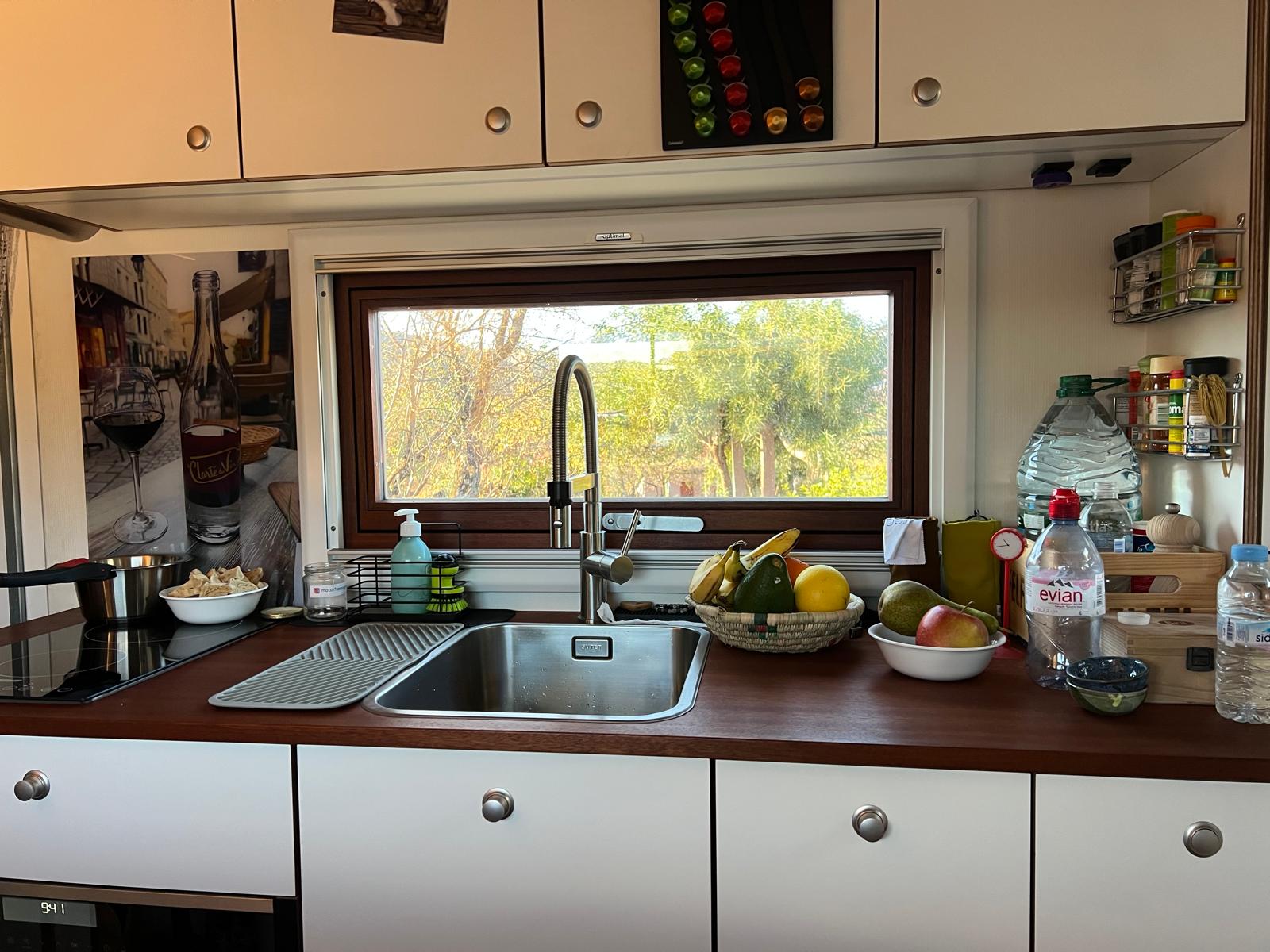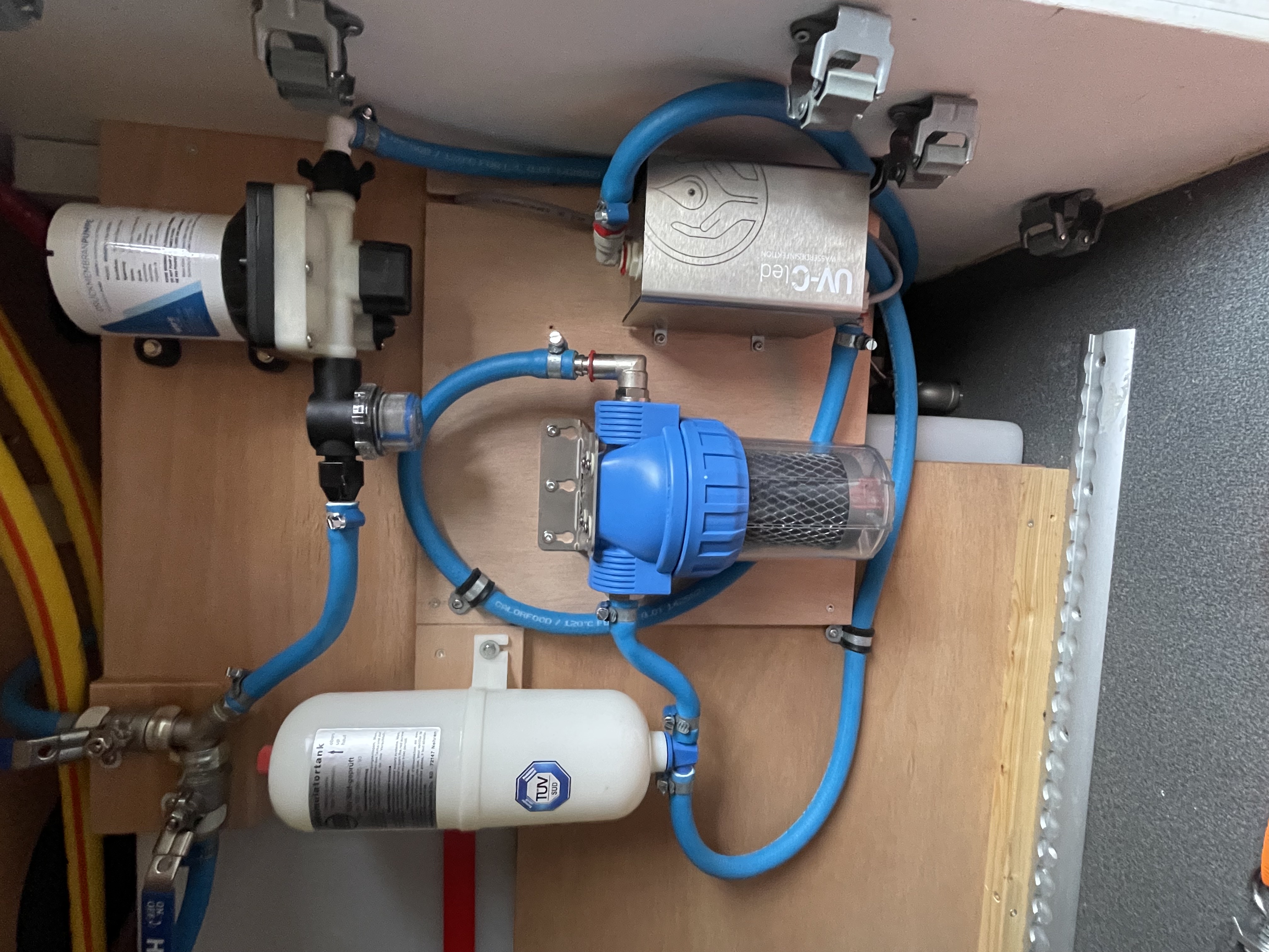 Frischwasser: 2 x 150 Liter Tank innliegend / WM-Aquatec Druckmembranpumpe / Ausgleichsbehälter.