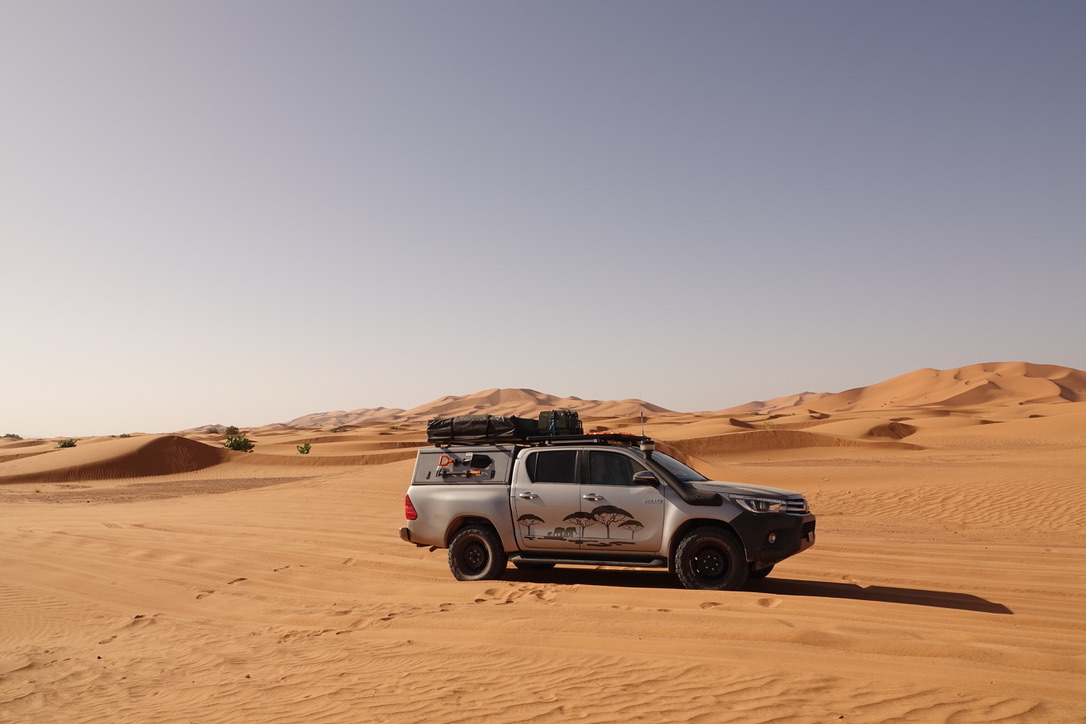 Für Expeditionsfahrten bauen wir die hintere Sitzbank jeweils aus und ersetzen sie mit Einbausets für den Kühlschrank, ein Reserverad und eine Ablagewanne auf dem Reserverad. Diese Umrüstung ist einfach zu bewerkstelligen und hat sich sehr bewährt. Ohne diese Umrüstung ist der Hilux ein komfortables 5-plätziges Fahrzeug.