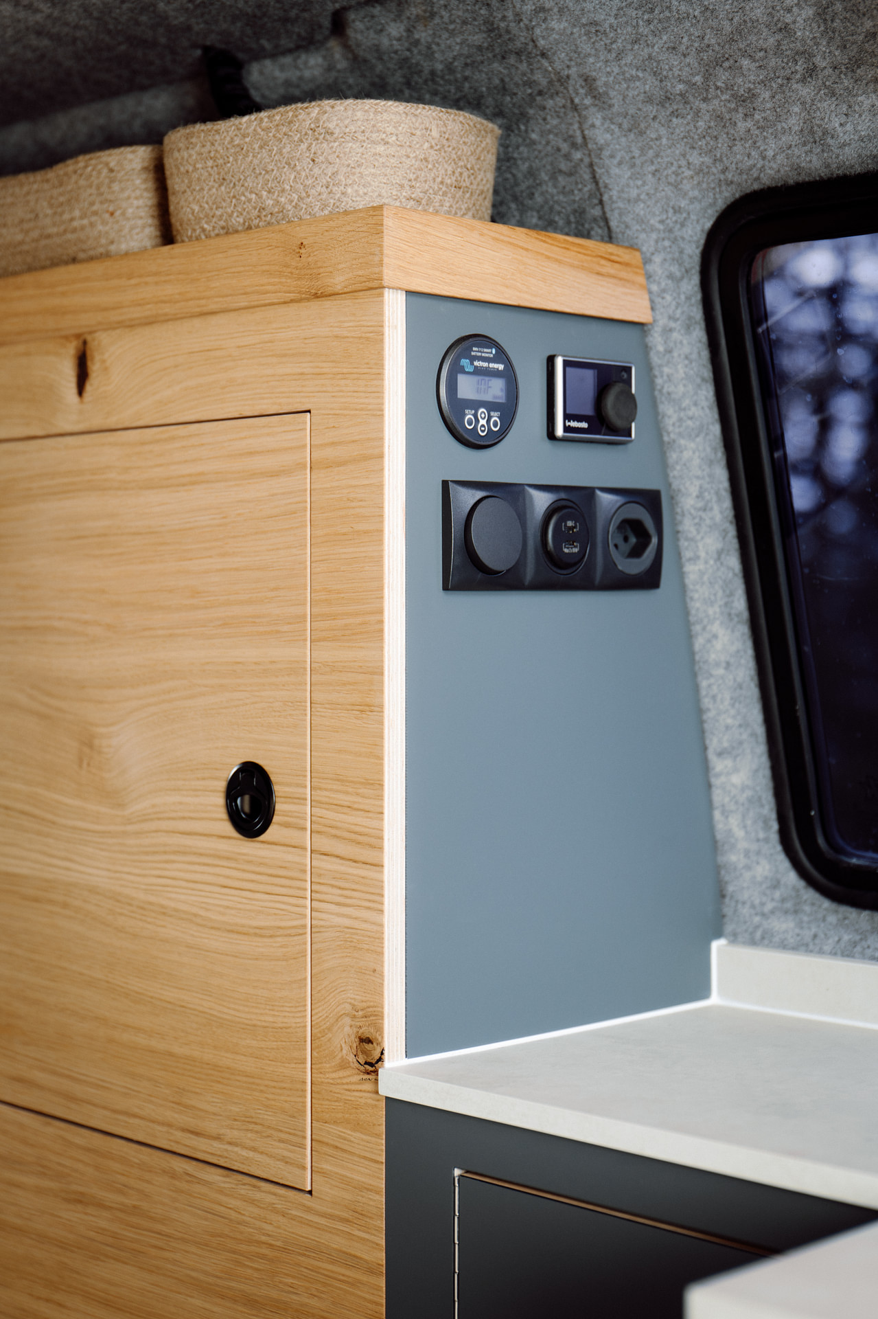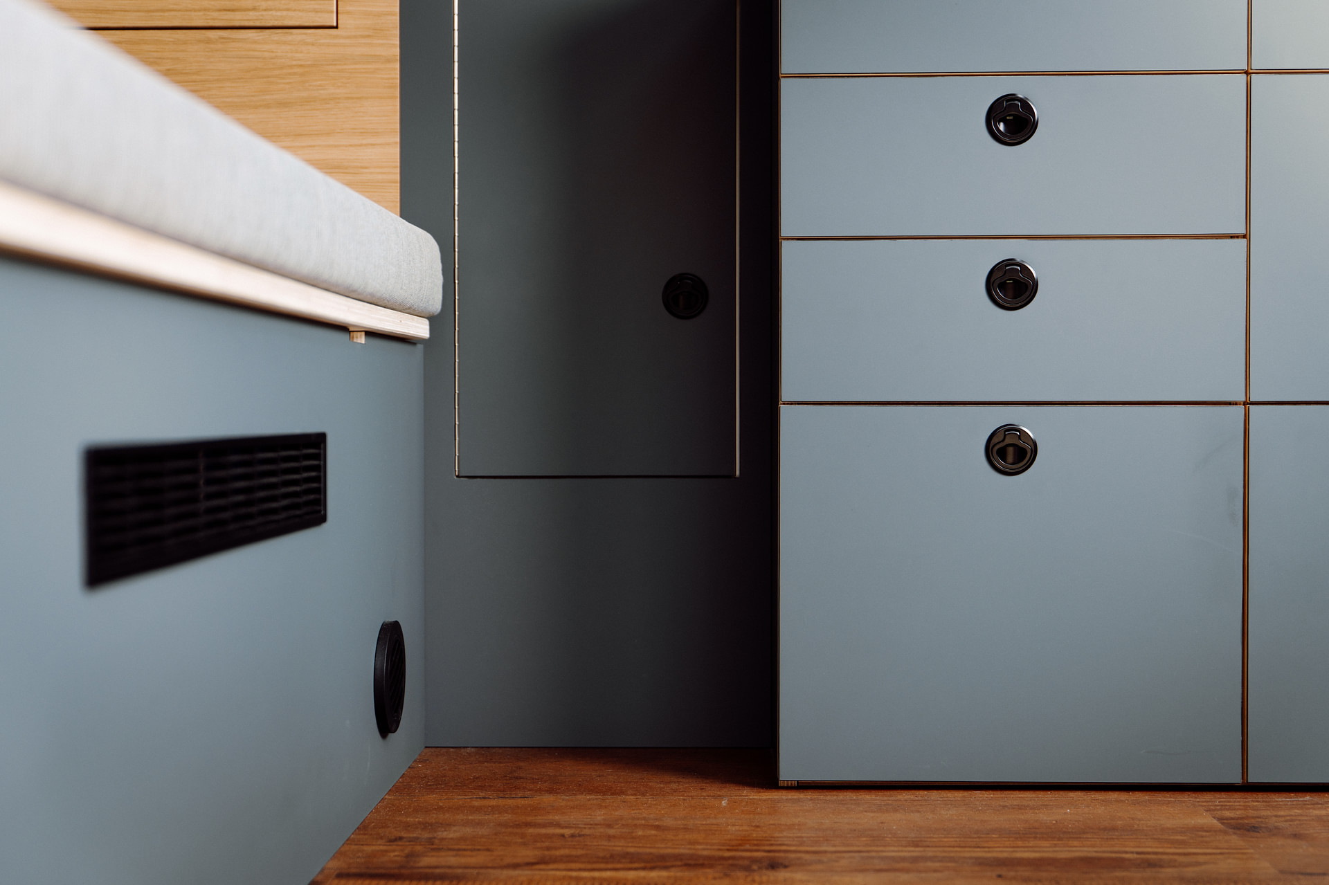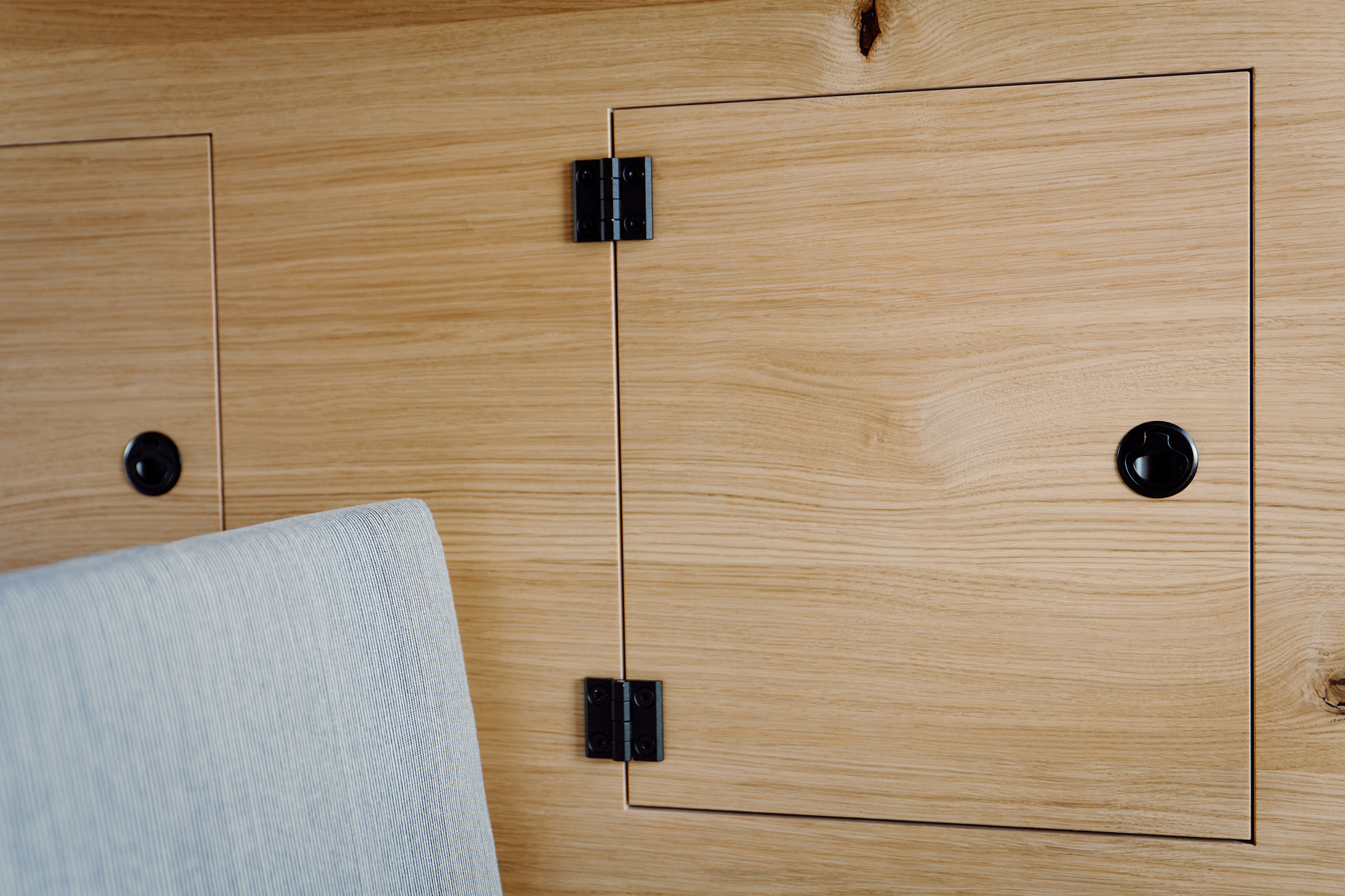 - Möbelbau aus Leichtbauplatten mit Fenix Antifingerprint-Beschichtung und furnierten Eichenfronten
