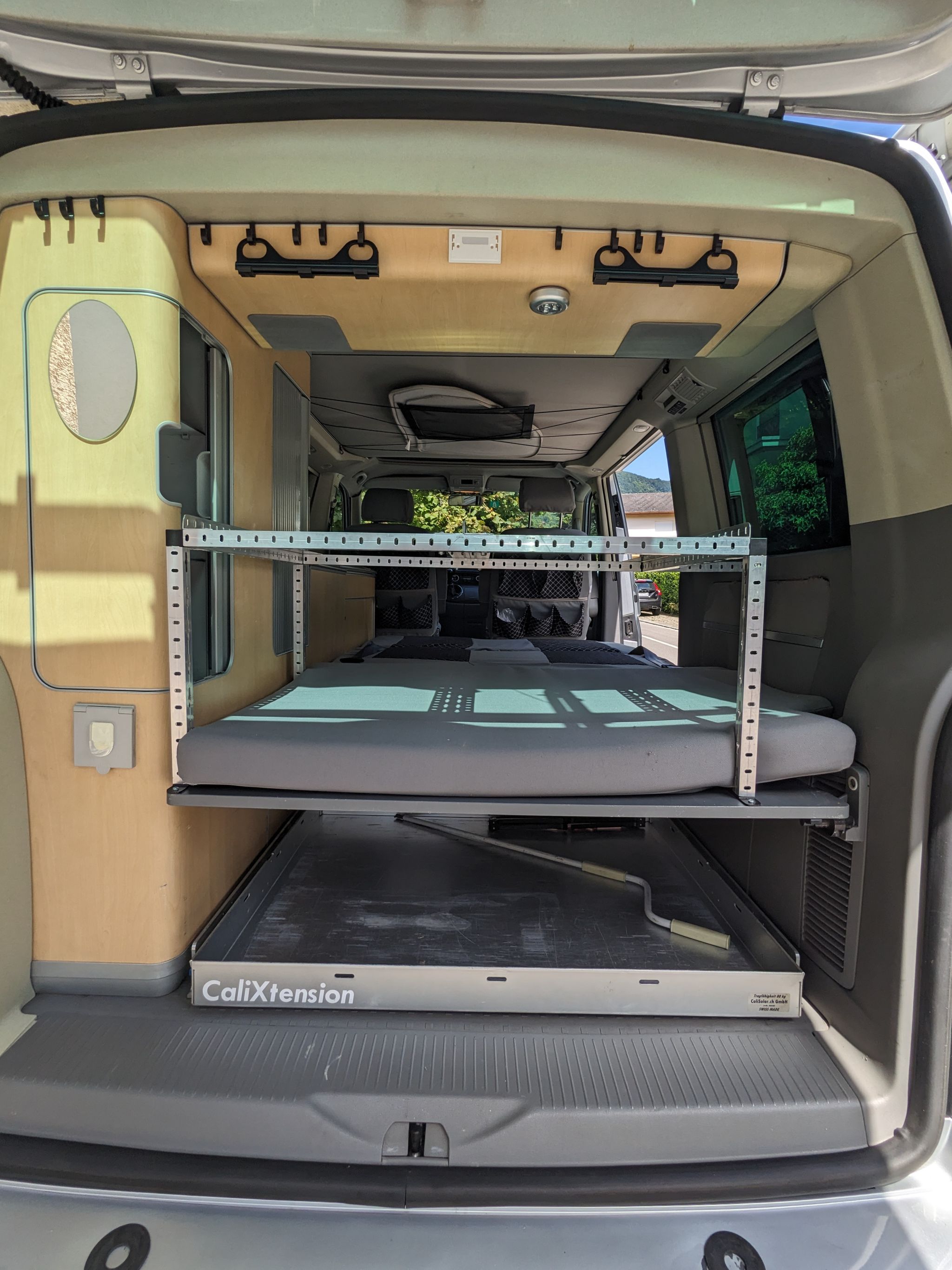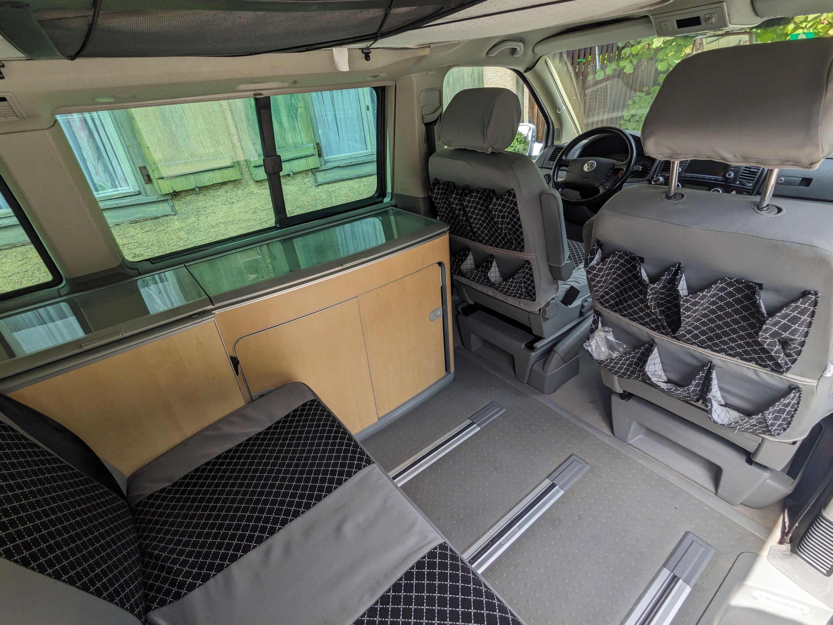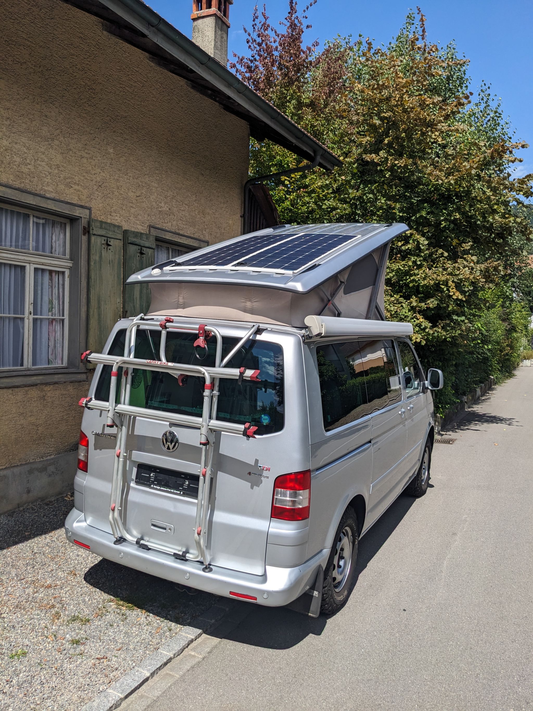 Der VW T5 California verfügt über eine Solaranlage auf dem Dach, ein Victron-Ladegerät und einen Aussenanschluss für eine Dusche. Im Innenraum wurde (nahezu) nie gekocht, er ist also in einem entsprechend gepflegten Zustand. Sämtliche Services wurden zu rund 95 % in VW-Garagen durchgeführt; die restlichen Arbeiten – etwa der Einbau der Solaranlage – wurden von einer spezialisierten Werkstatt im Zürcher Oberland vorgenommen.