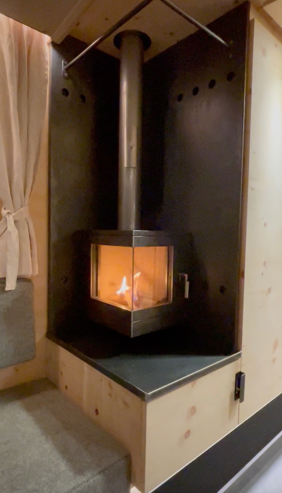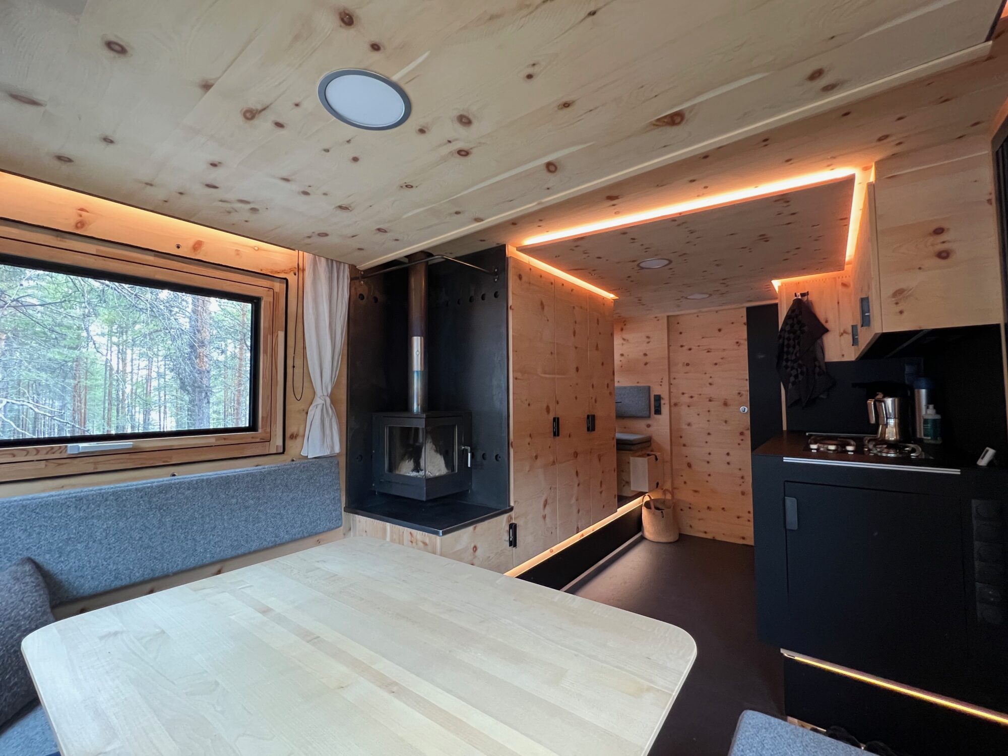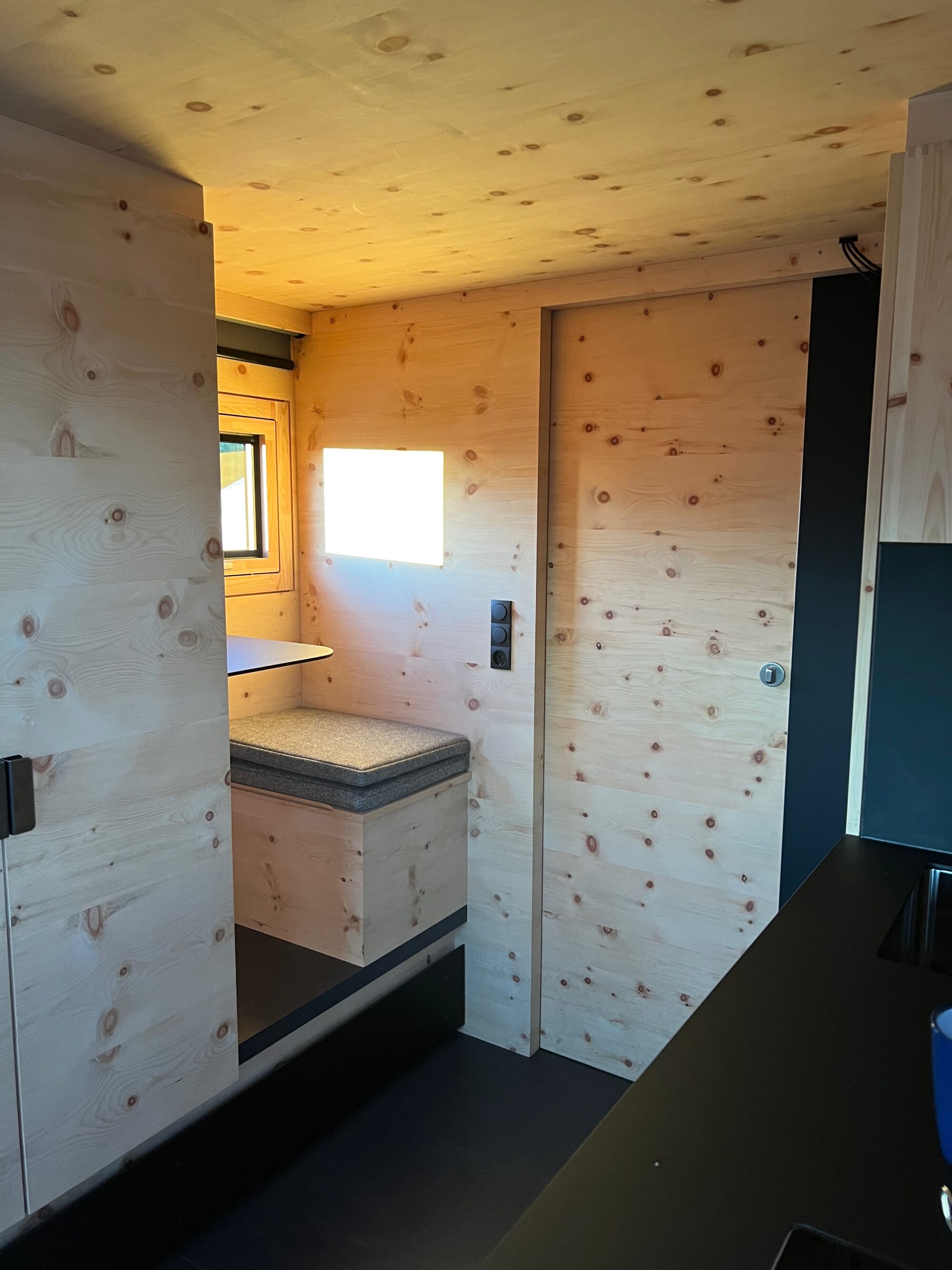 Die Zirbenbox ist 6 m lang und 2,55 m breit – und bietet Tiny House Wohnkomfort. Besonderheit der Wohnkabine ist eine separate Büroecke mit zusätzlichem Fenster – hier kann man sowohl sitzend als auch stehend arbeiten. Der grosse Kamin mit Glasfront – hergestellt im Appenzell (Schweiz) – bietet unglaubliche Gemütlichkeit. Durch die lange Kabine konnte eine grosszügige Dusche und in der Küche ein extra Apothekerschrank realisiert werden. Bewährte Schatzmeister-Funktionalität mit grossem Hubbett (200 x 155 cm) mit Rosshaar-Matratze von Moosbuerger, Aufstelldach, sehr geräumiger Sitzecke, zwei Terrassenmodule (1,8 m x 4 m). Gekocht wird mit Gas (2 x 11 kg Gasflaschen mit beheiztem Ventil). Weitere Spezifikationen sind: 450 l Frischwasser, 140 l beheizter Grauwassertank, Trenntoilette, 2 x 200 Ah 24V Lithium-Ionen-Batterien, 1840 Watt Solar, gesamte Elektronik von Mastervolt, strukturierte Netzwerkverkabelung (CAT6), 4G Industrie-Internet-Router, vielen USB A/B Anschlüssen , hochwertige Wasserfilterlösung von Famous Water, zwei redundante Dieselheizungen für die Wohnkabine, Motostandheizung und Luft-Standheizung in der CrewCab, Honda-Generator 22i zum Laden der Batterie im Winter, Dachträger mit Platz für z.B. 8 Taf-Cases, abnehmbarer Motorradlift.