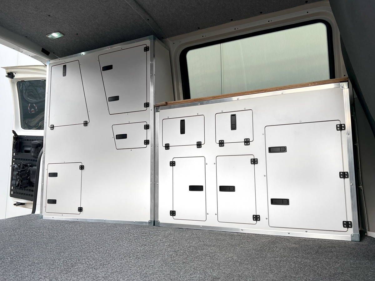 Dieser Innenausbau richtet sich an Abenteurer, die ihren VW Bus sowohl im Alltag als auch auf langen Reisen und Offroad-Pisten nutzen. Version 2 verzichtet bewusst auf einen fix integrierten Kühlschrank und schafft stattdessen ein zusätzliches verschliessbares Staufach – ideal für Kühlboxen, flexible Kochsysteme oder variable Ausrüstung.