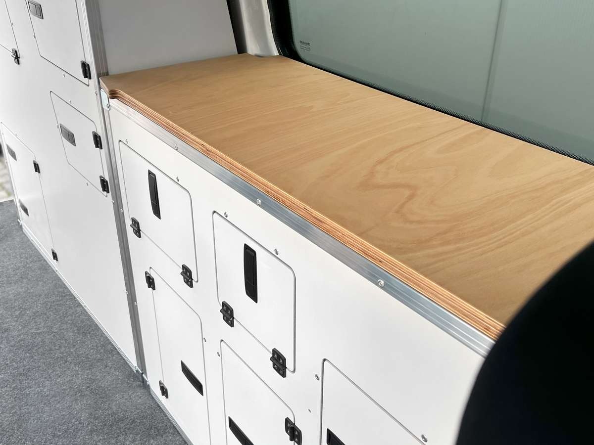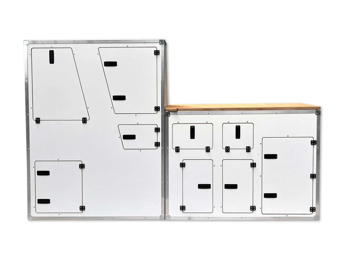 Die durchgehende Arbeitsplatte erlaubt freie Platzierung von Kocher-, Spül- oder Modul-Lösungen in Deiner Wunschgrösse. Hochwertige Materialien und eine pistenerprobte Konstruktion sorgen für Langlebigkeit auch unter rauen Bedingungen.