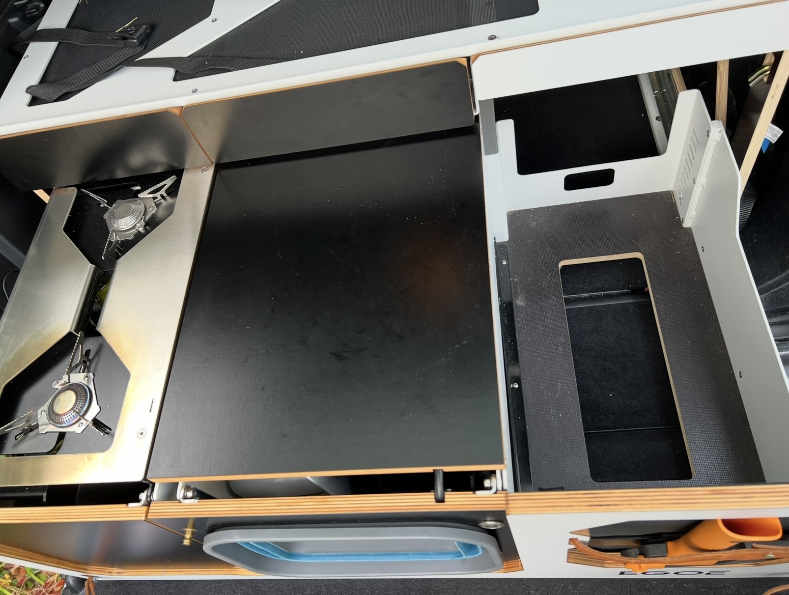- Korpus NST 501: die Hauptschublade mit Raum für Kocher, Wasser und Kühlbox o.ä. Das Modul beinhaltet 2 kleinere Schubladen für Küchenzubehör, 1 Schublade mit Messer und Arbeitsfläche, 1 Outdooraxt.