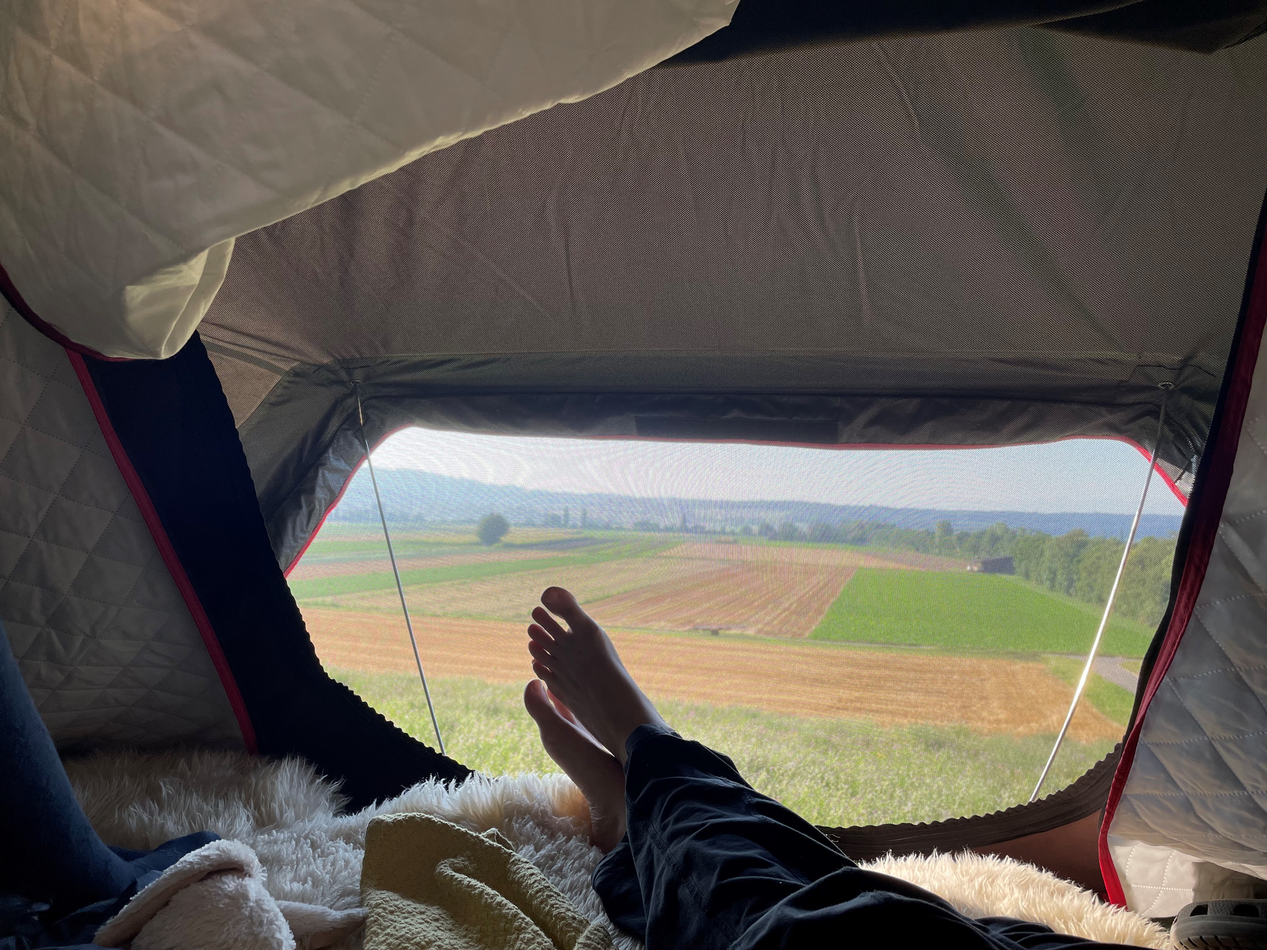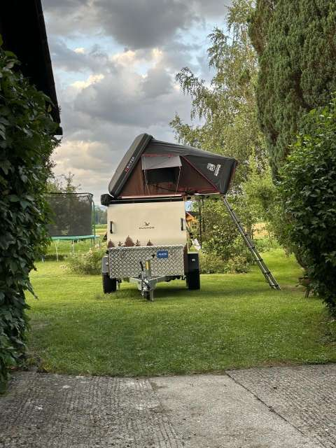 - Dachzelt von iKamper für 4 Personen (für zwei Personen ist super viel Platz, auch ein Erwachsener mit zwei Kindern geht sehr gut – zu viert wäre es eher eng).